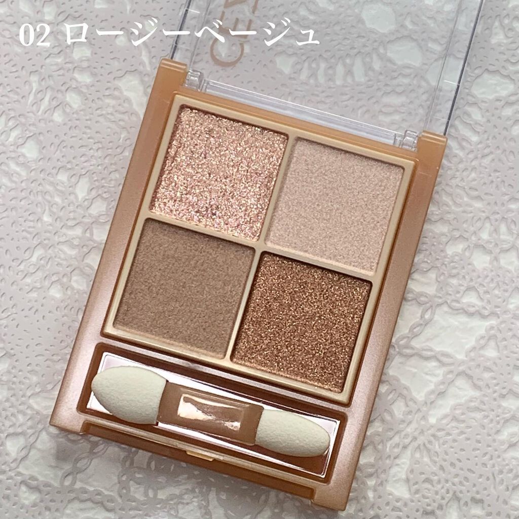 - ラメ・パール・マット3質感の4色アイシャドウ。 肌馴染みの良いベージュを基調としたカラー。ラメ・パール・マットの3質感を重ねて、自然にまぶたを強調し奥行のある大きな目元へ。 しっとり溶け込むような柔らかなパウダーなので、スルスル伸びてまぶたにピタッと密着。保湿成分(スクワラン・ホホバ種子油)配合。