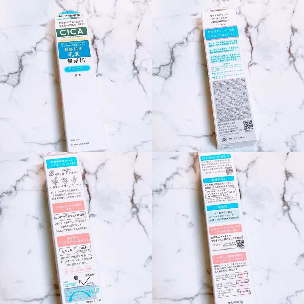 - <リペア&バランス マイルドミルク> 水、グリセリン、エチルヘキサン酸セチル、DPG、イソノナン酸イソノニル、リンゴ酸ジイソステアリル、トリ(カプリル酸/カプリン酸)グリセリル、ツボクサ葉エキス、セラミドNP、バオバブ種子油、ワサビノキ種子油、ワサビノキ種子エキス、ヒアルロン酸Na、BG、加水分解バオバブエキス、オレンジ果皮油、ローズマリー葉油、レモン果実油、ラベンダー油、ベルガモット果実油、ライム油、レモングラス油、チョウジ葉油、チョウジエキス、カナリヤノキ樹脂油、コリアンダー果実油、ショウズク種子油、ユーカリ葉油、ビターオレンジ葉/枝油、アオモジ果実油、メボウキ油、ニオイテンジクアオイ油、セラミドNG、セラミドAP、クエン酸、クエン酸Na、アスパラギン酸、アルギニン、PCA、グリシン、アラニン、セリン、プロリン、トレオニン、ヒスチジン、フェニルアラニン、バリン、リン酸2Na、イソロイシン、ジグリセリン、イソステアリン酸イソステアリル、ペンタステアリン酸ポリグリセリル-10、ミツロウ、シクロヘキサン-1,4-ジカルボン酸ビスエトキシジグリコール、エチルヘキシルグリセリン、イソステアリン酸、ステアリン酸ポリグリセリル-10、フェノキシエタノール、カルボマー、(アクリレーツ/アクリル酸アルキル(C10-30))クロスポリマー、ステアロイルグルタミン酸Na、キサンタンガム、ラウロイルグルタミン酸ジ(フィトステリル/オクチルドデシル)、水酸化Na、ポリアクリル酸Na、メタリン酸Na、トコフェロール、異性化糖、水添レシチン、ダイズステロール、PCA-Na、乳酸Na、オリゴペプチド-56アミドPEG-75メチルエーテル、パルミチン酸