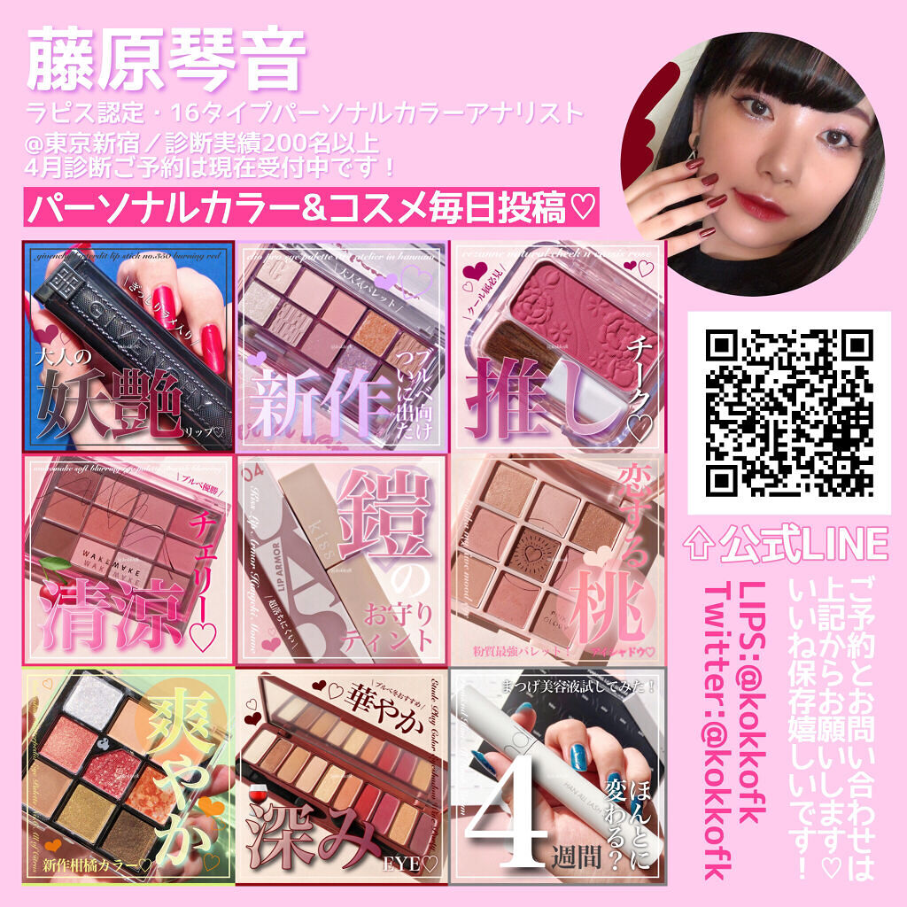 薄く唇に密着する新作マットティント。 マットなのにかなりしっとりとしていて 乾燥を感じなくてびっくりでした! 一気にこなれ感が出るトレンドカラーです♡ やや青みの華やかローズレッド 公式画像より鮮やかめに感じました。 やや黄みの強くて深いオレンジレッド ストロングオータムに超激推しです! やや黄みの非常に深く濃いダークブラウン ディープオータムに激推しです! かわいい雰囲気になれるピンクリップです♡ やや青みの柔らかいくすみピンクベージュ ミューテッドサマーにおすすめです! 青みの落ち着いたローズピンク やや青みのとても鮮やかなビビッドレッド ビビッドウィンターに特におすすめ! 既存マットティントよりもさらに ふわふわなマット感が魅力のリップで、 軽くティッシュオフしてもほとんど落ちない◎ マスクにも激推しのティントなので、 ぜひ皆さんもチェックしてみてね❤︎