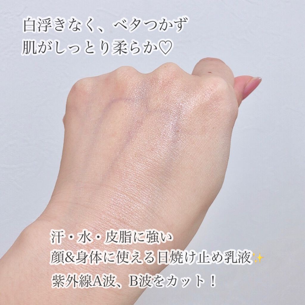 - 無香料・無着色・超純水使用・アレルギーテスト済み(全ての方にアレルギーが起きないというわけではありません) 【商品特長】 ・ 日常生活からレジャーまで対応の全身用日やけ止め乳液です。 ・ 汗、水、皮脂に強く、UVカット効果が持続します。 ・ みずみずしく肌へなじむテクスチャーです。 ・ 肌に白さを残さず透明な仕上がりになります。