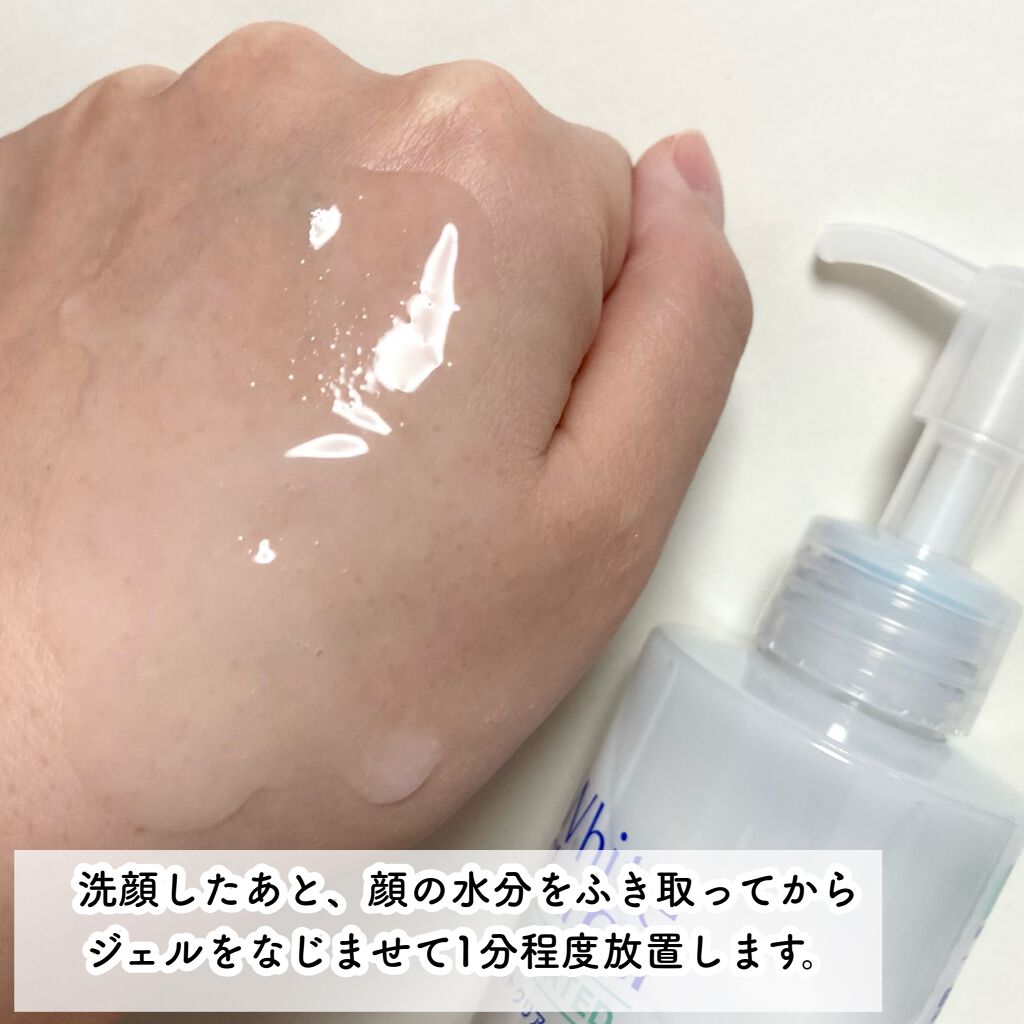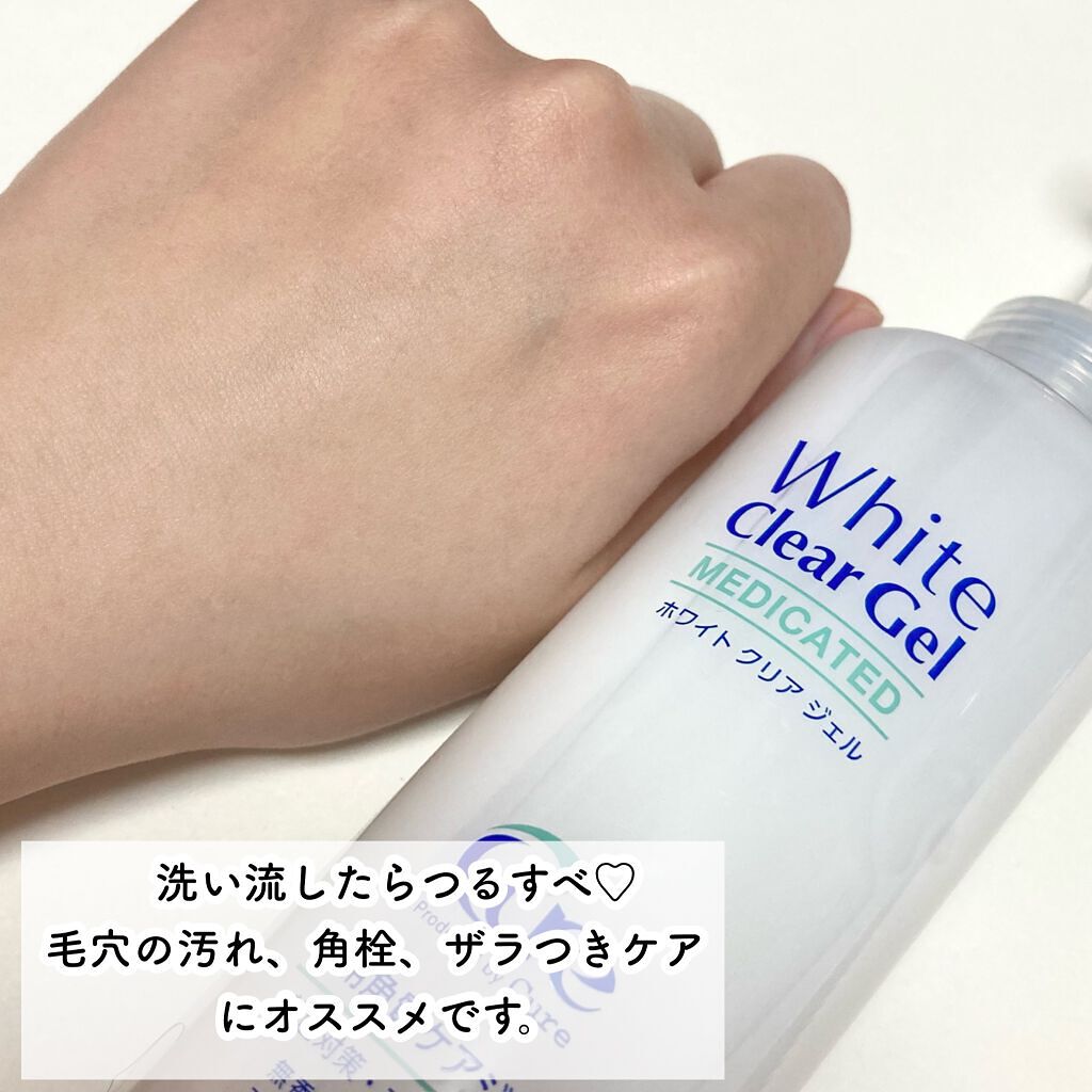 - 肌表面の不必要な古い角質をやさしくキャッチして取り除くと同時に、シミやニキビのケアまで可能な角質ケア製品です。肌トラブルの原因となる古い角質を除去し、素肌のくすみ※2やざらつきを取り除くことで、白く透明感のある肌※3に導き、化粧水などの美容成分の浸透を高めます。 美白※1のスキンケアにとって、大切な事はスキンケア前に「しっかり汚れを落とすこと」。古い角質は顔をくすませ、シミの発生や繰り返す大人ニキビの原因にもなります。「ホワイトクリアジェル」は古い角質や皮脂汚れなどと反応し、お肌に負担をかけずに汚れを落とします。また、そうすることで効果・効能が認められたシミ・そばかすを防ぐ成分と肌荒れを防ぐ成分の2つの有効成分※4※5を肌へ届きやすくします。 肌への効果と優しさの両方を考えて、無香料・無着色・アルコールフリー・シリコンフリー・石油系界面活性剤フリーで作られています。また、保湿・整肌効果のある5つの厳選植物エキス、「タイムエキス(1)・ユキノシタエキス・モモ葉エキス・チャエキス(1)・アーティチョークエキス」を配合しています。 週に2回本製品で角質ケアを行うことで美容成分の浸透を高め、毎日のお手入れをより効果的にし、つるりとしたクリアな肌に整えます。約90%が水でできており、顔だけでなく全身にお使いいただけます。ニキビができやすい「背中・デコルテ」をはじめ、黒ずみが気になる「ひじ・ひざ・かかと・お尻」にも、ぜひご使用ください。 ※1美白とは、メラニンの生成を抑え、日焼けによるシミ・そばかすを防ぐこと ※2古い角質による ※3古い角質を洗い流すことによる ※4ニチレイ・水溶性プラセンタエキスB ※5グリチル酸2K