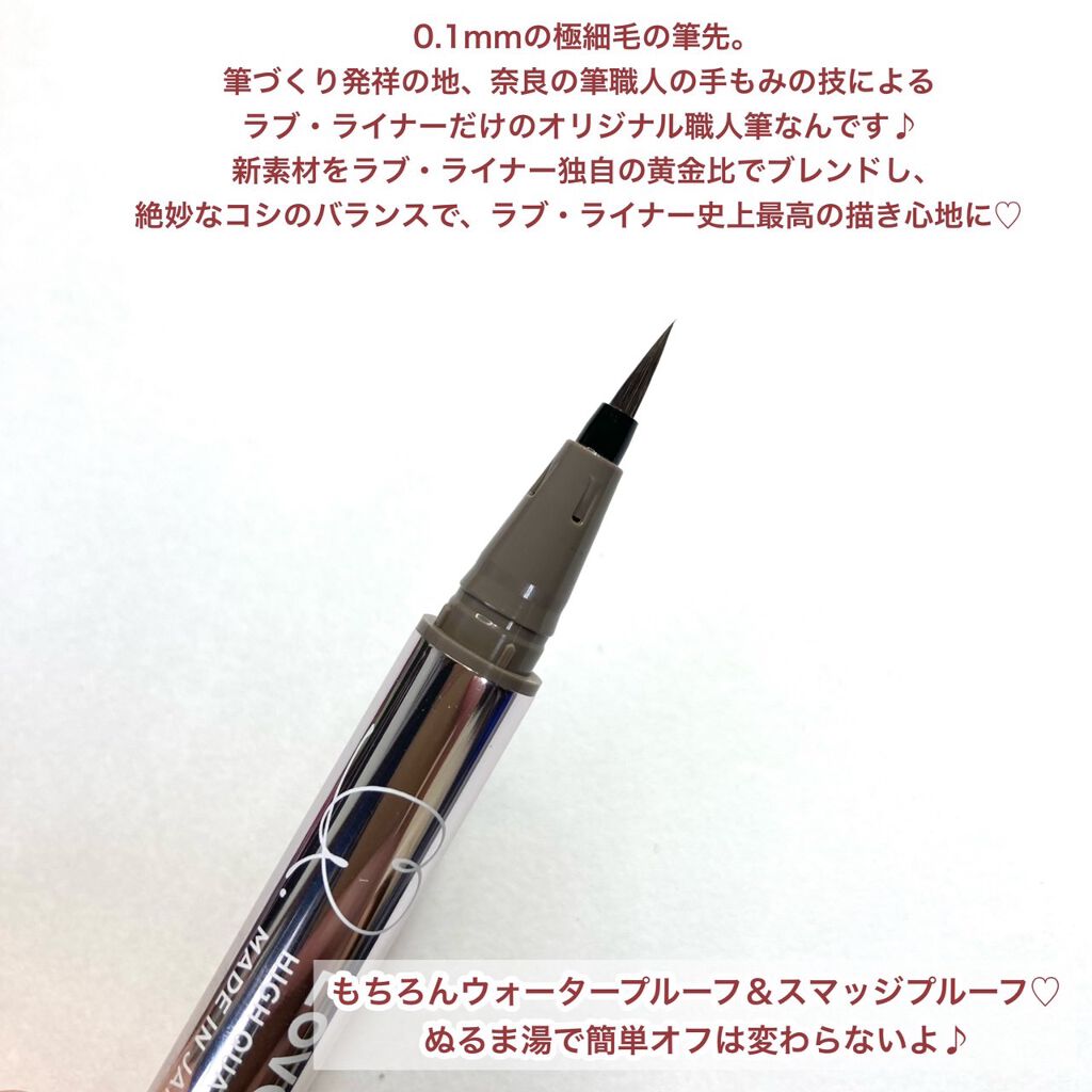 - 「0.1mmの極細毛の筆先」、「手ブレを防ぐ重さのあるアルミボトル」、「ウォータープルーフ&スマッジプルーフ」、「ぬるま湯で簡単オフ」という特長は従来品から引き継ぎ、新たに3つの特長をプラスしました。 1.ラブ・ライナー史上初!つけ替えができて繰り返し使える「リユーザブルボトル」に進化 筆とインクがセットになった専用リフィルをつけ替えることで、お気に入りのボトルを繰り返し使うことができます。 2.ラブ・ライナーだけの黄金比率。職人の手もみブレンドでできたオリジナル職人筆 筆づくり発祥の地、奈良の筆職人の手もみの技によるラブ・ライナーだけのオリジナル職人筆を採用。新素材をラブ・ライナー独自の比率でブレンドし、まぶたに最もふさわしいやわらかさとコシのバランスで、ラブ・ライナー史上最高の描き心地を実現。 3.10種類の美容成分配合※ 従来品に配合していた5種類の美容成分に加え、まつげケアを叶える美容成分を新規配合。合計10種類の美容成分※でメイクするたびに美しい目元へ。 ※保湿成分のこと
