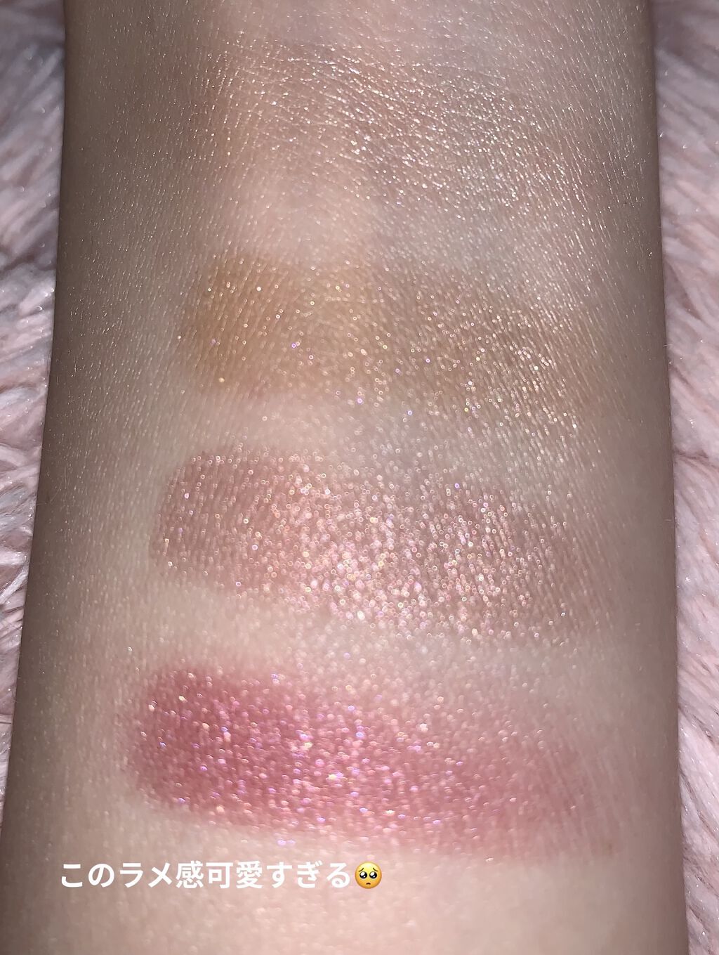 特に右上のピンク!! 見た感じだと浮きそうだな〜 と思いましたが、実際に塗るとほんのりピンクにしてくれてめちゃくちゃ可愛かった🥺❤️ 今回は右上のピンクをベースとして広めに塗ってますが、地黒の私でも浮いてないのが分かっていただけますか?🥲 モーブ系欲しいけど浮きそうで怖い!という方にはこのパレットおすすめです〜🫶 スウォッチ後、ハンドソープで洗ってみたらしっかりラメまで落ちてくれたのも素晴らしい✨ ちゃんと石鹸落ちコスメでした😌