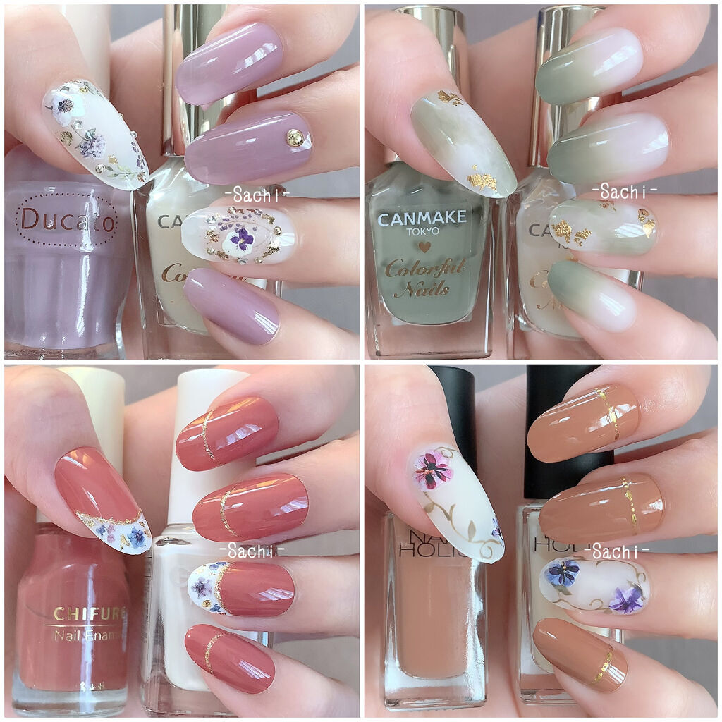 ワンカラーでも指ごとに色を変えるだけでオシャレに見えます💕 画像のようにゴールドラインとストーンを少し足すだけで華やかさがアップ🥰 何度かご紹介したことのあるスポンジで作るグラデーションです✨ スポンジを使うことで境目が綺麗に馴染んでくれます💕 アルミホイルの上でブラウンとトップコートを1:1くらいで混ぜたものを、トップコートのハケに取って3箇所に塗るだけ👌 事前に混ぜたものを塗ることで、爪の上でぼかすより簡単に出来ます💕 ベースカラーが乾く前に点置きしてぼかすことで綺麗にぼかせます✨ スピードが大事なので、使うポリッシュのキャップは全て開けておきましょう😊 天然石のラインはガタガタの方がより天然石っぽく見えるので、ラインを描くのが苦手な方でも大丈夫🙆♀️ 難しそうに見えて、やってみると意外と簡単に出来ます♡