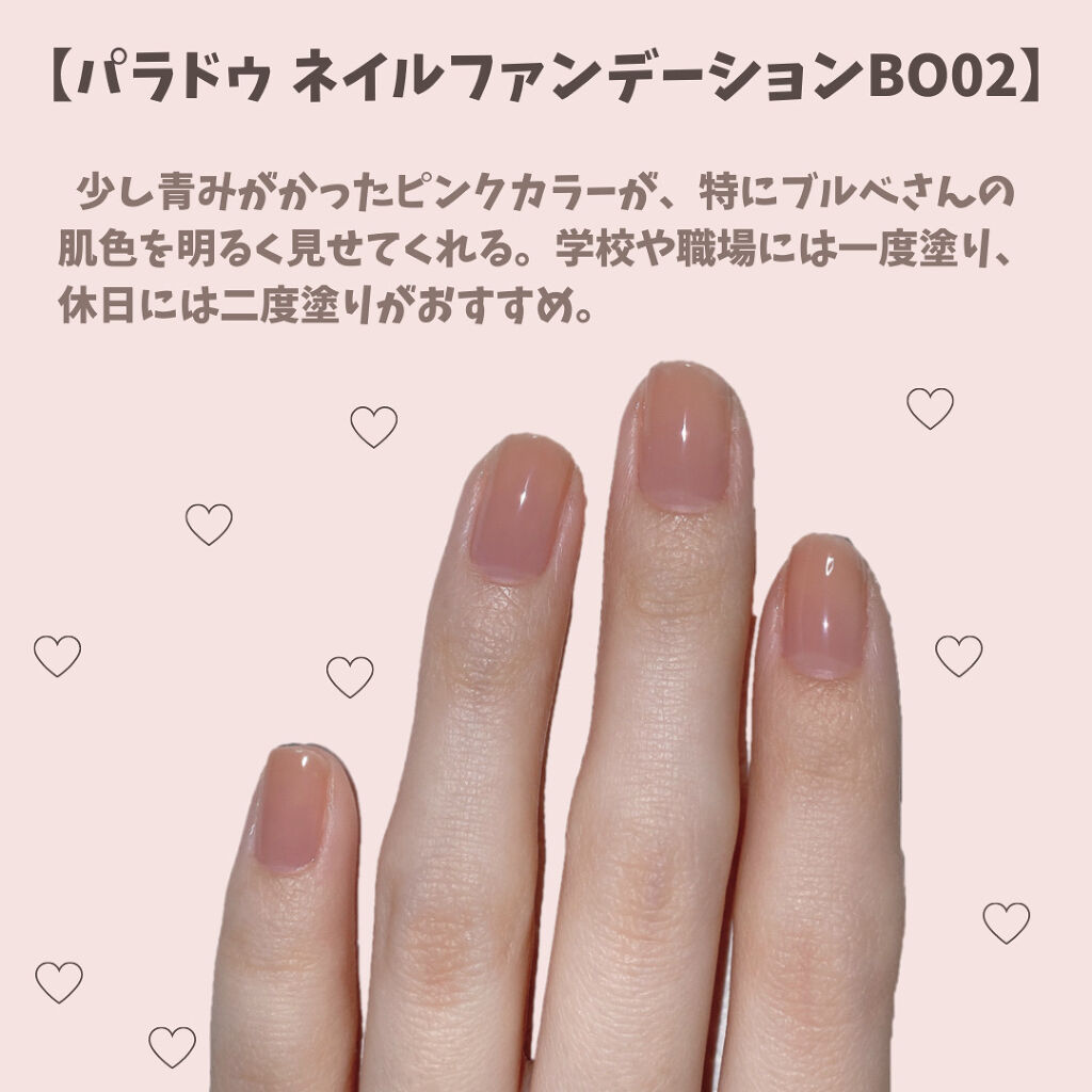 ニュートラルトーンで特に肌馴染みがよく、パーソナルカラーを問わず誰にでも似合う絶妙なコーラルピンクです。 ミルキーなベージュがとても可愛いです。特にイエベの方の肌に綺麗に馴染む色味で、一度塗りでも爪の色を均一に見せてくれます。 少し青みのあるピンクで、春を感じさせるような可愛らしく上品な色味です。特にブルベの方の肌によく馴染み、肌をぱっと明るく見せてくれます。