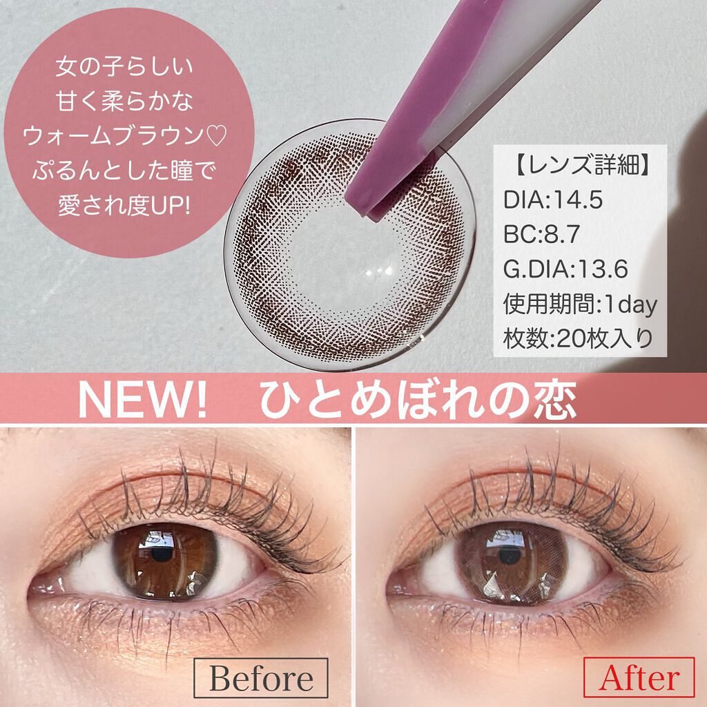 ほんのり甘いピンクブラウンで、ぷるぷるちゅるちゅると透明感のある瞳になれるカラコン🫶🏻💘 自然にトーンアップを叶えてくれる甘くやわらかなピンクカラーで、可愛さ溢れる印象になれちゃいます🐰🫧 着色直径は13.6mmと程よいサイズ感◎ 大きすぎず小さすぎないので、こっそり盛れるのも嬉しい〜🥹💖