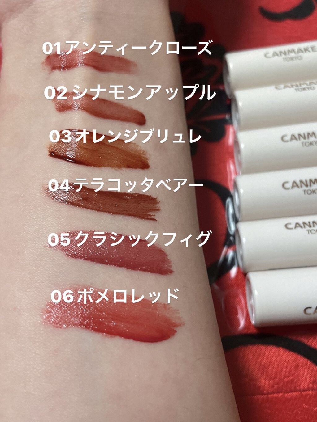 - <01 アンティークローズ> 水添ポリイソブテン、水、オクチルドデカノール、BG、エタノール、グリセリン、セテアリルアルコール、イソステアリン酸PEG-60グリセリル、ステアリン酸グリセリル、(アクリル酸ヒドロキシエチル/アクリロイルジメチルタウリンNa)コポリマー、フェノキシエタノール、ジメチコン、クエン酸Na、トコフェロール、水酸化Al、クエン酸、ジフェニルシロキシフェニルトリメチコン、スクワラン、ホホバ種子油、ヒアルロン酸Na、硫酸Ba、加水分解コラーゲン、セラミドNP、ソメイヨシノ葉エキス、カミツレ花エキス、酸化チタン、酸化鉄、黄4、赤227、赤104(1)、赤226、青1、グンジョウ <05 クラシックフィグ > 水添ポリイソブテン、水、オクチルドデカノール、BG、エタノール、グリセリン、パルミチン酸エチルヘキシル、セテアリルアルコール、イソステアリン酸PEG-60グリセリル、ステアリン酸グリセリル、(アクリル酸ヒドロキシエチル/アクリロイルジメチルタウリンNa)コポリマー、フェノキシエタノール、ジメチコン、クエン酸Na、トコフェロール、水酸化Al、クエン酸、ジフェニルシロキシフェニルトリメチコン、スクワラン、ホホバ種子油、ヒアルロン酸Na、硫酸Ba、加水分解コラーゲン、セラミドNP、ソメイヨシノ葉エキス、カミツレ花エキス、酸化チタン、酸化鉄、黄4、赤227、赤226、青1