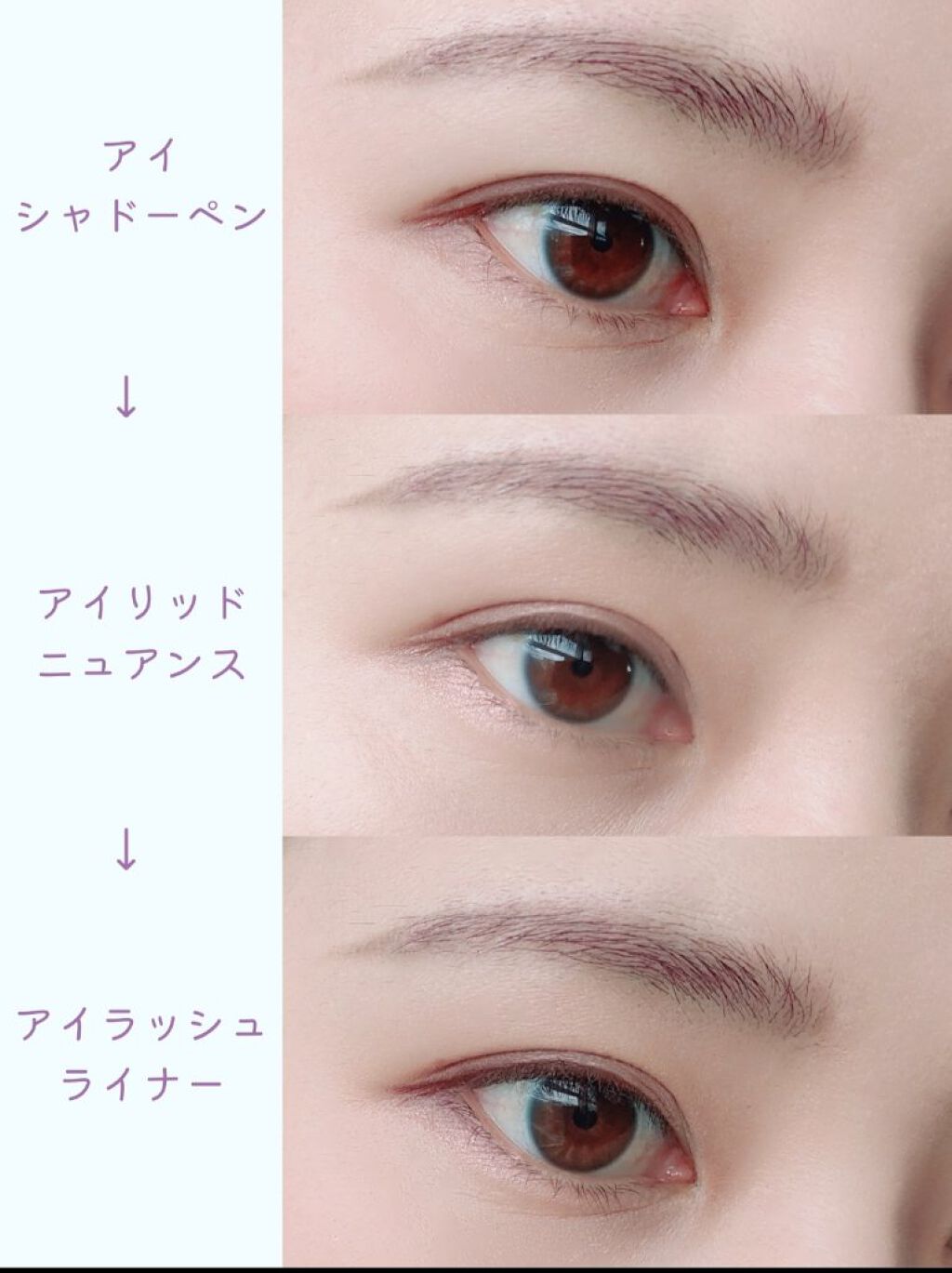 #UNMIX#アイリッドニュアンス01アプリコットベージュ#アイシャドーペン01ピンクシャドー#アイラッシュライナー02バーガンディーアイシャドーペンを塗るとベールをかけたように、少し彫りがでてきますアイシャドーペンを二重幅に塗ってから、アイ...