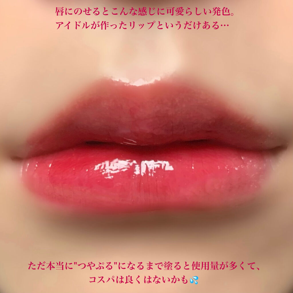 鮮やかな真紅がパッと目を引きます。 しっかり塗りでも似合う方いると思いますが、 日常使いならぽんぽん塗りがおすすめ。 万能リップ美容液…!これは以前から愛用しています。 夜にトリートメントとして塗っても良いし、 このようにグロスとして使っても可愛い。ちらちら細かいラメが入っています。