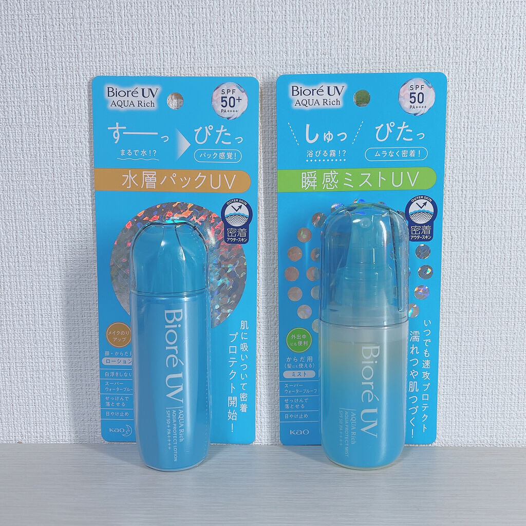 信頼ビオレの日焼け止め徹底比較アクアリッチシリーズです。●基本情報①ビオレUVアクアリッチウォータリーエッセンスクリーム色のクリームです。チューブから出てくるやつ(以後クリーム)②ビオレUVアクアリッチアクアプロテクトミストミストが出せる透明...