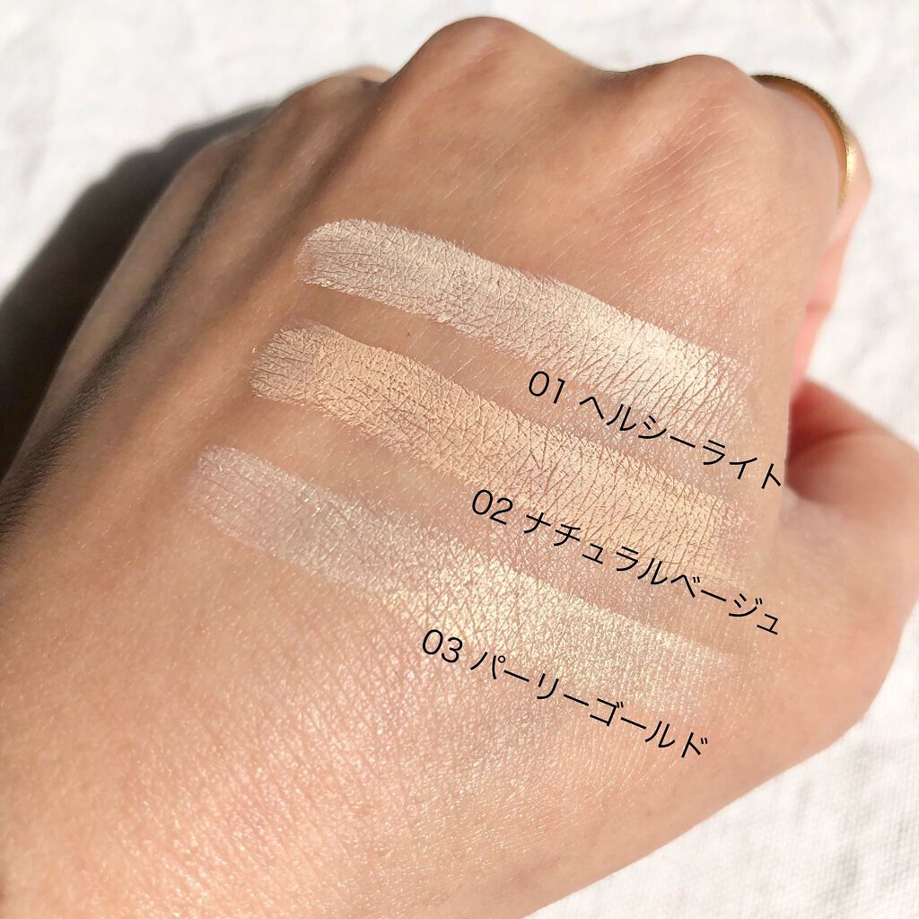 - <01 ヘルシーライト> シリカ、酸化チタン、パルミチン酸エチルへキシル、マイクロクリスタリンワックス、合成ワックス、トリ(カプリル酸/カプリン酸)グリセリル、ポリイソブテン、ビスジグリセリルポリアシルアジペート-2、酸化鉄、酢酸トコフェロール <02 ナチュラルベージュ> シリカ、パルミチン酸エチルへキシル、酸化チタン、マイクロクリスタリンワックス、合成ワックス、トリ(カプリル酸/カプリン酸)グリセリル、ポリイソブテン、酸化鉄、ビスジグリセリルポリアシルアジペート-2、青1、酢酸トコフェロール <03 パーリーゴールド> パルミチン酸エチルへキシル、酸化チタン、マイクロクリスタリンワックス、合成ワックス、トリ(カプリル酸/カプリン酸)グリセリル、ホウケイ酸(Ca/チタン)、ポリイソブテン、マイカ、シリカ、ビスジグリセリルポリアシルアジペート-2、合成フルオロフロゴパイト、酸化スズ、酢酸トコフェロール