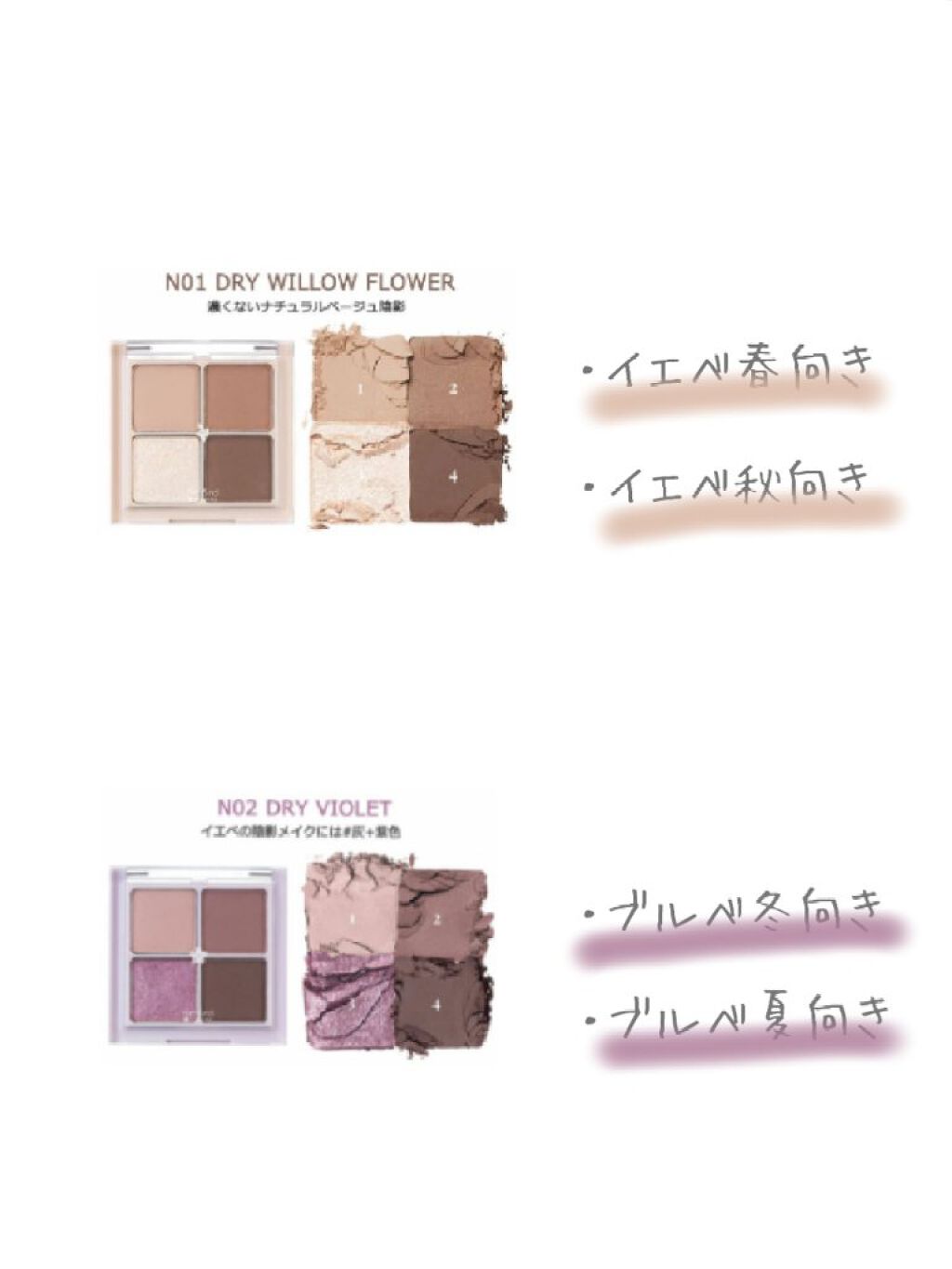TO1…トゥウインキラ 《イエベ春》 01…Dry Mango Tulip(ドライマンゴーチューリップ) 《イエベ春、イエベ秋》 02…Dry Rose(ドライローズ) 《ブルベ夏》 03…Dry Ragras(ドライラグラス) 《イエベ秋》 MO1…DryApple Blossom (ドライアップル) 《イエベ秋、イエベ春》 MO2…Dry Buck Wheat Flower(ドライバクウィートフラワー) 《ブルベ冬、ブルベ夏》 MO3…Dry Cosmos(ドライコスモス) 《イエベ秋、イエベ春》 WO1…Dry Lavender(ドライラベンダー) 《ブルベ夏、ブルベ冬》 WO2…Dry Peach Blossom(ドライピーチブロッサム) 《イエベ春》 WO3 …Dry Strawberry(ドライストロベリー) 《ブルベ夏》 NO1…Dry Willow Flower(ドライウィローフラワー) 《 イエベ春、イエベ秋》 NO2…Dry Violet(ドライヴァイオレット) 《ブルベ冬、ブルベ夏》