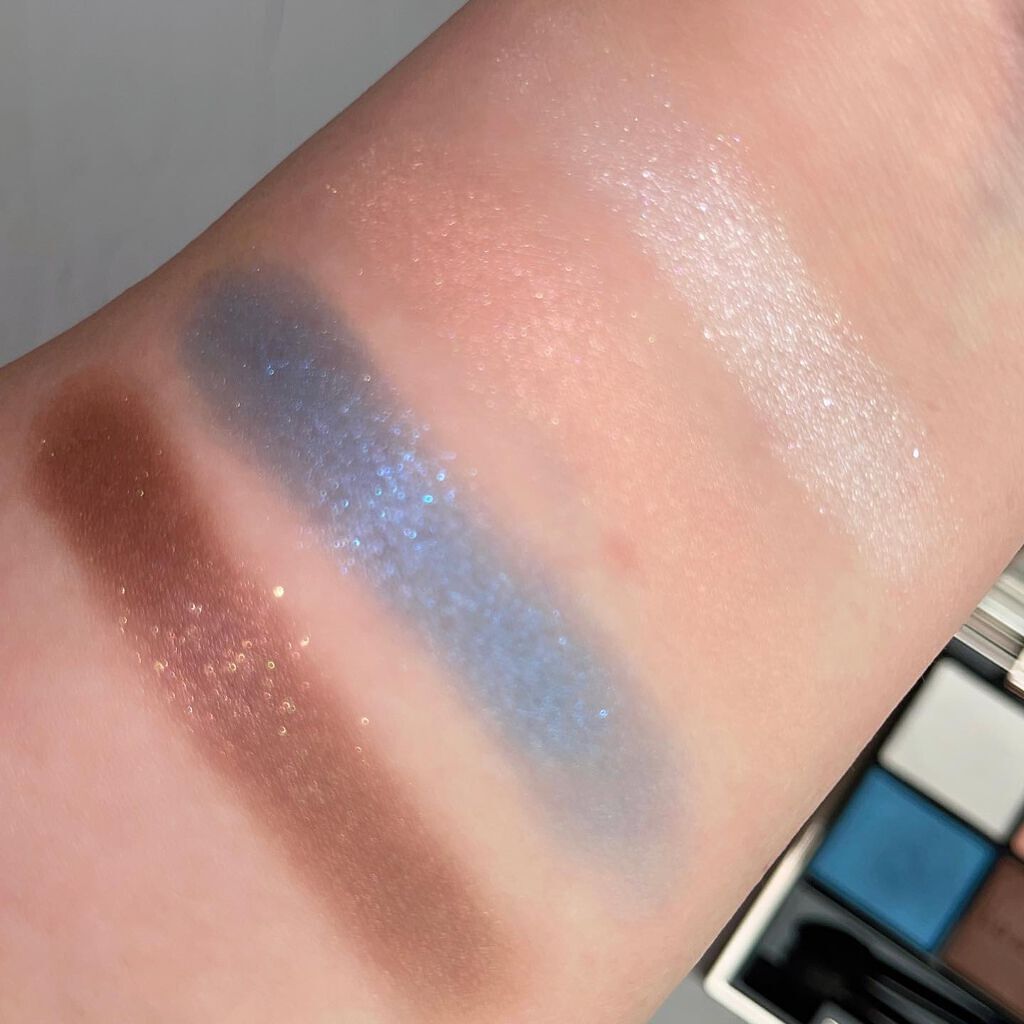 左上は深みのあるブルーベースに鮮やかなブルーパールがふんだんに散りばめられた魅惑的なカラー 右上はただのマットブラウンかと思いきや、よーく目を凝らすとこまかーいシルバー?ラメがチラチラと✨ 左下もよくあるメタリックなオレンジかと思いきや、ピンクやゴールド(パープルも?)の多色ラメがたっくさん✨ 一目惚れした右下はくすみのあるグリーンベースにグリーンやブルーやシルバーなどの多色ラメ満載の、まさに孔雀の羽の色ようなオシャレで複雑なカラー🦚 オイルが配合されているというだけあって、しっとりと肌に吸い付くような質感で、ワンストロークでもしっかり色が乗るよ👌