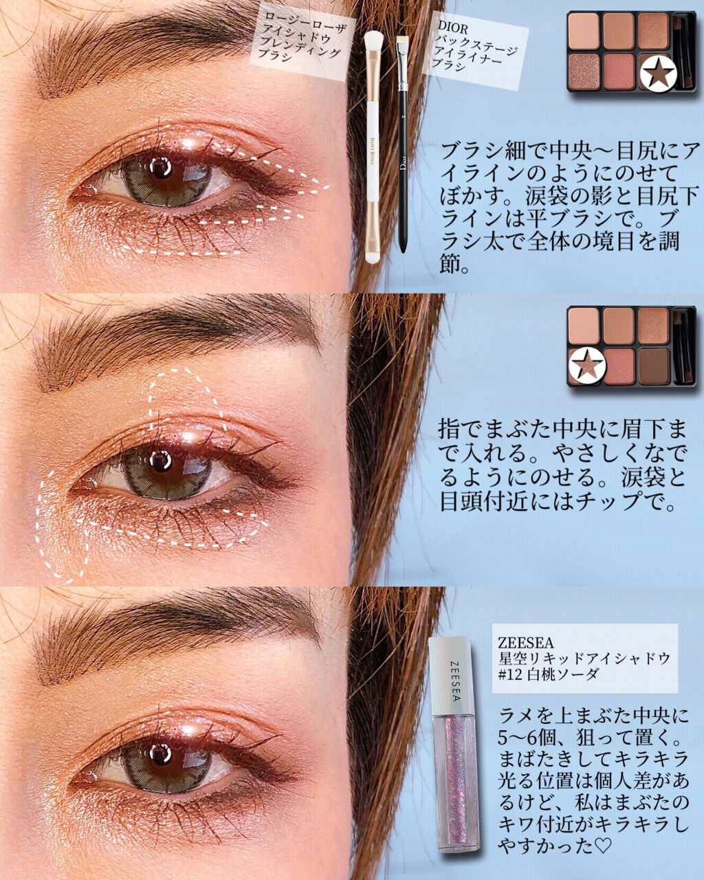 ❶プライマー塗ると言うより凸凹にすり込む要領です。 ❷下地DIOR FOREVER SKIN VEILを、手で顔全体に塗る。私は下地は手の温かさで広げるのが好き。潤いながらトーンアップ! ❸ファンデーションDIOR FOREVER SKIN GLOWを、濡らして固く絞った3Dメイクスポンジでポンポン叩くようにして薄く顔全体に広げていく。 ❺パウダーDIOR FOREVER SKIN POWDER優しく叩く感じで顔全体に。パウダー+フィックスミスト、という組み合わせでかなり崩れ防止になるのでパウダーはぜひ使って下さい! ❻フィックスミストCLARINS Fix Make-Upこれが一番好き♡鼻・頬辺りにシュッとかける。