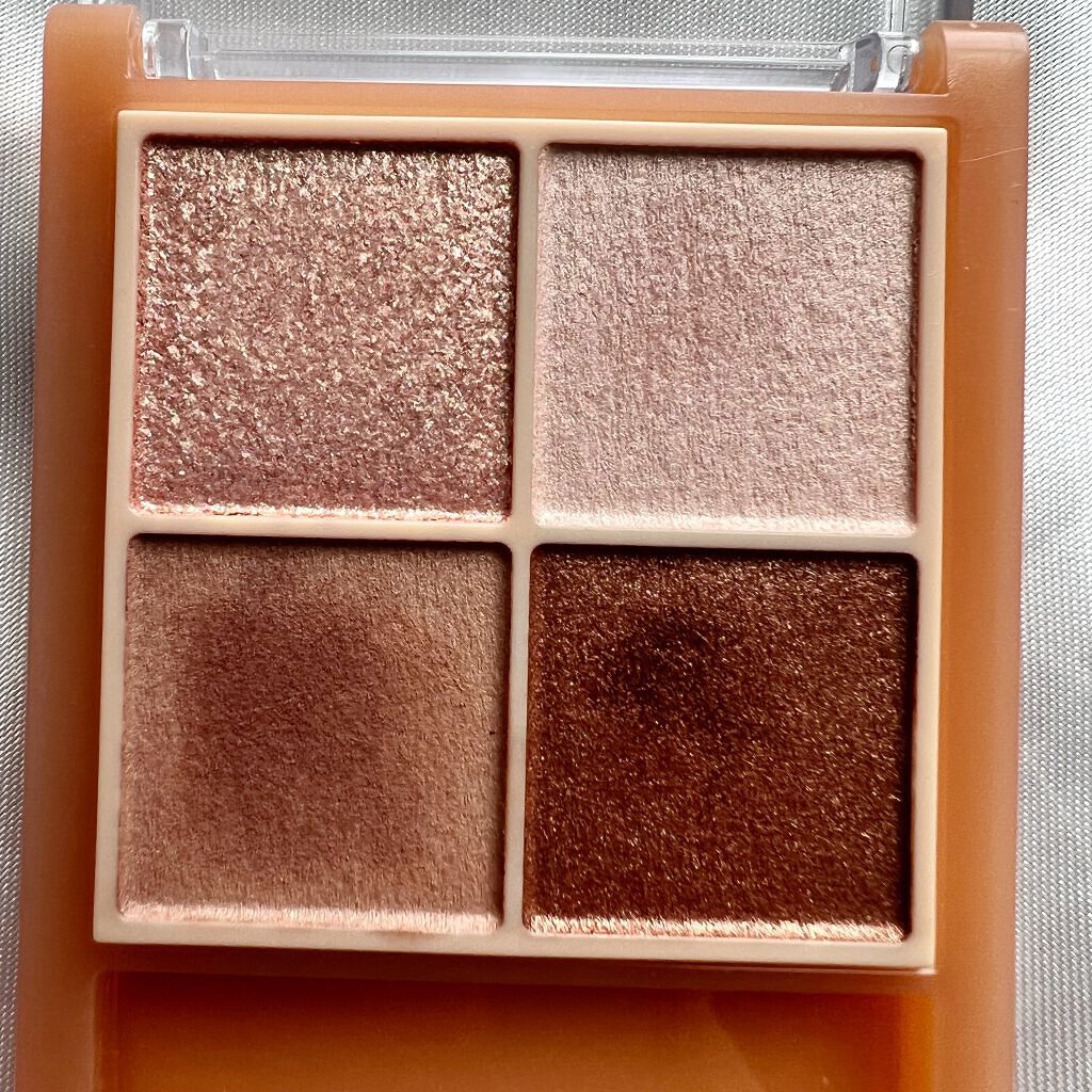 - ラメ・パール・マット3質感の4色アイシャドウ。 肌馴染みの良いベージュを基調としたカラー。ラメ・パール・マットの3質感を重ねて、自然にまぶたを強調し奥行のある大きな目元へ。 しっとり溶け込むような柔らかなパウダーなので、スルスル伸びてまぶたにピタッと密着。保湿成分(スクワラン・ホホバ種子油)配合。
