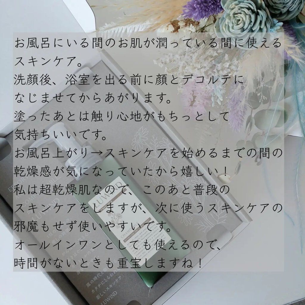 - おうち時間を充実させる、新しいインバススキンケア。 1日の終わりにバスタイム中に浴室で使える『LUWIND (ルワインド)』は、朝までしっかり潤う新しいオールインワン乳液です。カモミールの香りを中心に、数種類のハーブの香りを調合。身体も心もゆっくりほぐれていきます。自由や平等を象徴する【風の時代】とも調和する、「カタチにとらわれない、新しいスキンケア」です。
