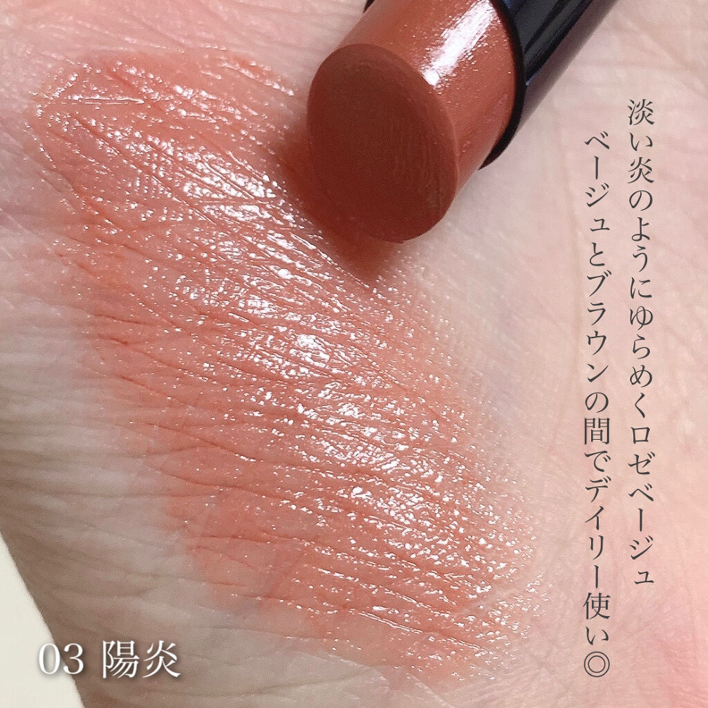 - <01 欲望の塊> テトライソステアリン酸ジペンタエリスリチル、トリ(カプリル酸/カプリン酸)グリセリル、オクチルドデカノール、ラウロイルグルタミン酸ジ(フィトステリル/オクチルドデシル)、ビスアルキル(C16-18)グリセリルウンデシルジメチコン、イソノナン酸イソトリデシル、水添ポリイソブテン、ラウロイルグルタミン酸ジ(オクチルドデシル/フィトステリル/ベヘニル)、パラフィン、合成ワックス、ダイマージリノール酸(フィトステリル/イソステアリル/セチル/ステアリル/ベヘニル)、マイクロクリスタリンワックス、水添マイクロクリスタリンワックス、ヒドロキシステアリン酸エチルヘキシル、トコフェロール、ホホバ種子油、オリーブ果実油、アーモンド油、(エチレン/プロピレン)コポリマー、ポリエチレン、ジメチコン、(+/-)(チタン/酸化チタン)焼結物、マイカ、ラウロイルアスパラギン酸Na、ラウロイルリシン、塩化亜鉛、酸化チタン、酸化鉄、水酸化Al、硫酸Ba、トリイソステアリン酸イソプロピルチタン、酸化スズ、ホウケイ酸(Ca/Al)、合成フルオロフロゴパイト、黄4、黄5、赤104(1)、赤201、赤202 <02 ピンクバナナ> テトライソステアリン酸ジペンタエリスリチル、トリ(カプリル酸/カプリン酸)グリセリル、オクチルドデカノール、ラウロイルグルタミン酸ジ(フィトステリル/オクチルドデシル)、ビスアルキル(C16-18)グリセリルウンデシルジメチコン、イソノナン酸イソトリデシル、水添ポリイソブテン、ラウロイルグルタミン酸ジ(オクチルドデシル/フィトステリル/ベヘニル)、パラフィン、合成ワックス、ダイマージリノール酸(フィトステリル/イソステアリル/セチル/ステアリル/ベヘニル)、マイクロクリスタリンワックス、水添マイクロクリスタリンワックス、ヒドロキシステアリン酸エチルヘキシル、トコフェロール、ホホバ種子油、オリーブ果実油、アーモンド油、(エチレン/プロピレン)コポリマー、ポリエチレン、ジメチコン、(+/-)(チタン/酸化チタン)焼結物、マイカ、ラウロイルアスパラギン酸Na、ラウロイルリシン、塩化亜鉛、酸化チタン、酸化鉄、水酸化Al、硫酸Ba、トリイソステアリン酸イソプロピルチタン、酸化スズ、ホウケイ酸(Ca/Al)、合成フルオロフロゴパイト、黄4、黄5、赤104(1)、赤201、赤202 <03 陽炎> テトライソステアリン酸ジペンタエリスリチル、トリ(カプリル酸/カプリン酸)グリセリル、オクチルドデカノール、ラウロイルグルタミン酸ジ(フィトステリル/オクチルドデシル)、ビスアルキル(C16-18)グリセリルウンデシルジメチコン、イソノナン酸イソトリデシル、水添ポリイソブテン、ラウロイルグルタミン酸ジ(オクチルドデシル/フィトステリル/ベヘニル)、パラフィン、合成ワックス、ダイマージリノール酸(フィトステリル/イソステアリル/セチル/ステアリル/ベヘニル)、マイクロクリスタリンワックス、水添マイクロクリスタリンワックス、ヒドロキシステアリン酸エチルヘキシル、トコフェロール、ホホバ種子油、オリーブ果実油、アーモンド油、(エチレン/プロピレン)コポリマー、ポリエチレン、ジメチコン、(+/-)(チタン/酸化チタン)焼結物、マイカ、ラウロイルアスパラギン酸Na、ラウロイルリシン、塩化亜鉛、酸化チタン、酸化鉄、水酸化Al、硫酸Ba、トリイソステアリン酸イソプロピルチタン、酸化スズ、ホウケイ酸(Ca/Al)、合成フルオロフロゴパイト、黄4、黄5、赤104(1)、赤201、赤202 <04 パンプキンワイン> テトライソステアリン酸ジペンタエリスリチル、トリ(カプリル酸/カプリン酸)グリセリル、オクチルドデカノール、ラウロイルグルタミン酸ジ(フィトステリル/オクチルドデシル)、ビスアルキル(C16-18)グリセリルウンデシルジメチコン、イソノナン酸イソトリデシル、水添ポリイソブテン、ラウロイルグルタミン酸ジ(オクチルドデシル/フィトステリル/ベヘニル)、パラフィン、合成ワックス、ダイマージリノール酸(フィトステリル/イソステアリル/セチル/ステアリル/ベヘニル)、マイクロクリスタリンワックス、水添マイクロクリスタリンワックス、ヒドロキシステアリン酸エチルヘキシル、トコフェロール、ホホバ種子油、オリーブ果実油、アーモンド油、(エチレン/プロピレン)コポリマー、ポリエチレン、ジメチコン、(+/-)(チタン/酸化チタン)焼結物、マイカ、ラウロイルアスパラギン酸Na、ラウロイルリシン、塩化亜鉛、酸化チタン、酸化鉄、水酸化Al、硫酸Ba、トリイソステアリン酸イソプロピルチタン、酸化スズ、ホウケイ酸(Ca/Al)、合成フルオロフロゴパイト、黄4、黄5、赤104(1)、赤201、赤202 <05 ダークフィグ> テトライソステアリン酸ジペンタエリスリチル、トリ(カプリル酸/カプリン酸)グリセリル、オクチルドデカノール、ラウロイルグルタミン酸ジ(フィトステリル/オクチルドデシル)、ビスアルキル(C16-18)グリセリルウンデシルジメチコン、イソノナン酸イソトリデシル、水添ポリイソブテン、ラウロイルグルタミン酸ジ(オクチルドデシル/フィトステリル/ベヘニル)、