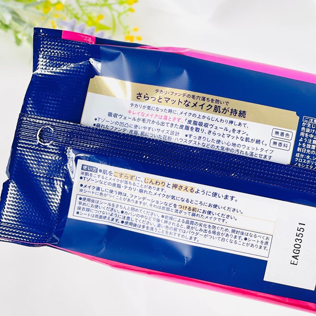1枚でさっとふんわりメイク直し。メイクの上から押さえるだけで「ふんわりぼかしパウダー」が肌の上にオン。毛穴、テカリ、肌のトーンなど日中気になってくるメイク肌をほどよくぼかします。 無香料・無着色です。Tゾーンのテカリ・ファンデの毛穴落ち防ぐ「さらマット肌持続シート」。テカリが気になった時に、メイクの上からじんわり押しあて、「皮脂吸収ヴェール」をオン。 使用後のほうがキレイに見えます。しばらくするとサラッサラになるので、メイク直しもとっても快適。