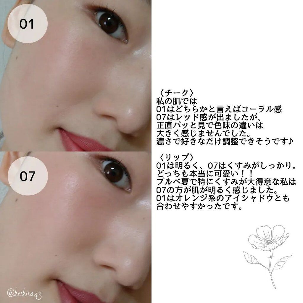 花から零れ落ちる涙をイメージして作られたデザインのリップ&チーク🫧 ボトルのデザインも、ほわっと儚げな質感と色味も、すべてに可愛さが詰め込まれてます🥰 ほんとに少量で済むので、1年ほど愛用してますがまだ無くなりません🥹コスパ最強…!! リキッドタイプだしヨレにくいので最後まで色味を保ってくれます👏🏻