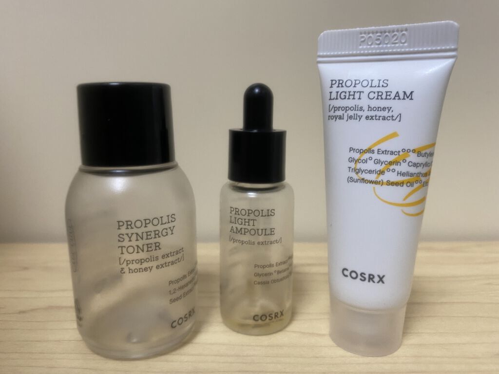プロポリスエキスがトナー・・72.6% アンプル・・83%だそうです。 香りはほぼないです。めっちゃ使いやすい。 トナーはどっちかというとシャバシャバ系のテクスチャー。 特に化粧水はストック買いしたいと思うほどに気に入った💞