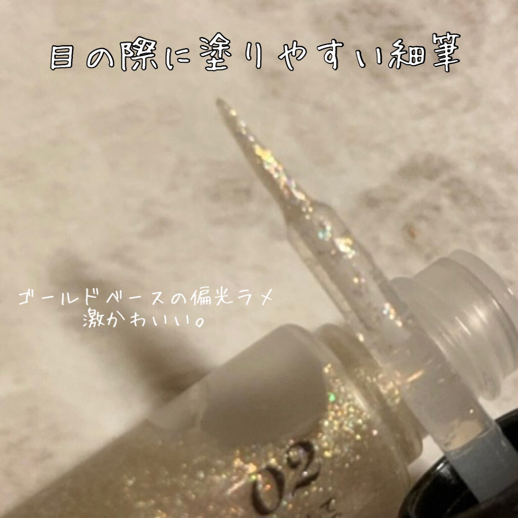 - 大粒すぎないから使いやすい! 高輝度ラメたっぷりのカラフルグリッター ラメの粒子サイズを大きくしすぎないことで、 悪目立ちしない絶妙な輝きに仕上げました。 ベース液にパールを多めに配合しているため、 サラッと控えめに塗ってもしっかり輝きます! やわらかく使い勝手の良い極細筆で、狙ったところにラメをオン! ☆使い方☆ 下まつげのキワに沿って 本品で細くアイラインを引くと、 オーロラに輝く印象的な目元の完成!