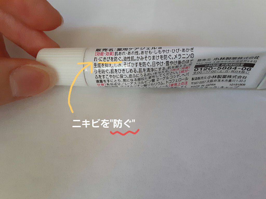 - 医薬部外品 1.目立って気になるニキビのあとに、メラニンの生成を抑える有効成分を配合 5種類※1の有効成分が、ニキビが治った後の肌に働きかけ、ニキビあとの肌トラブルの原因となる炎症やメラニンの生成を抑制し、ニキビ自体の再発も防ぐことできれいな肌に導きます。 また、植物から抽出したエキス※2なども配合しており、ニキビのあとの肌をケアします。 ※1 L-アスコルビン酸 2-グルコシド、ヘパリン類似物質、グリチルリチン酸ジカリウム、トコフェロール酢酸エステル、イソプロピルメチルフェノール、 ※2 エイジツエキス、アーティチョークエキス、オウバクエキス、油溶性甘草エキス(2)、アルピニアカツマダイ種子エキス(いずれも保湿成分) 2.さらっとなじみやすい薬用ジェルで、うるおいを与える さらっとしてベタつかないジェルタイプなので、肌にうるおいを与えながらケアができます。朝晩の洗顔後にお使いいただくことで、有効成分や保湿成分が肌の調子を整え、気になるニキビのあとの奥まで※3しっかりと浸透していきます。 ※3 角質層まで 販売名:薬用ケアジェルa