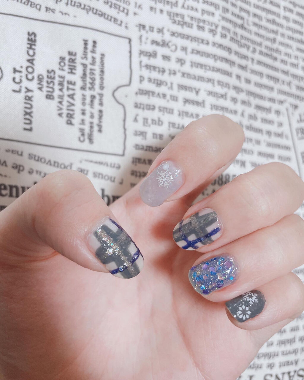 シンプルイズベストに寒色系でキメてみました。セリアのネイルシールの金色のうねうねシールは地味にお気に入りなので、結構使います。しずくネイルポリッシュのシアーホワイトの使用頻度も高めで、何でもかんでもついつい使う候補に入れちゃいます🥺縁どりシー...