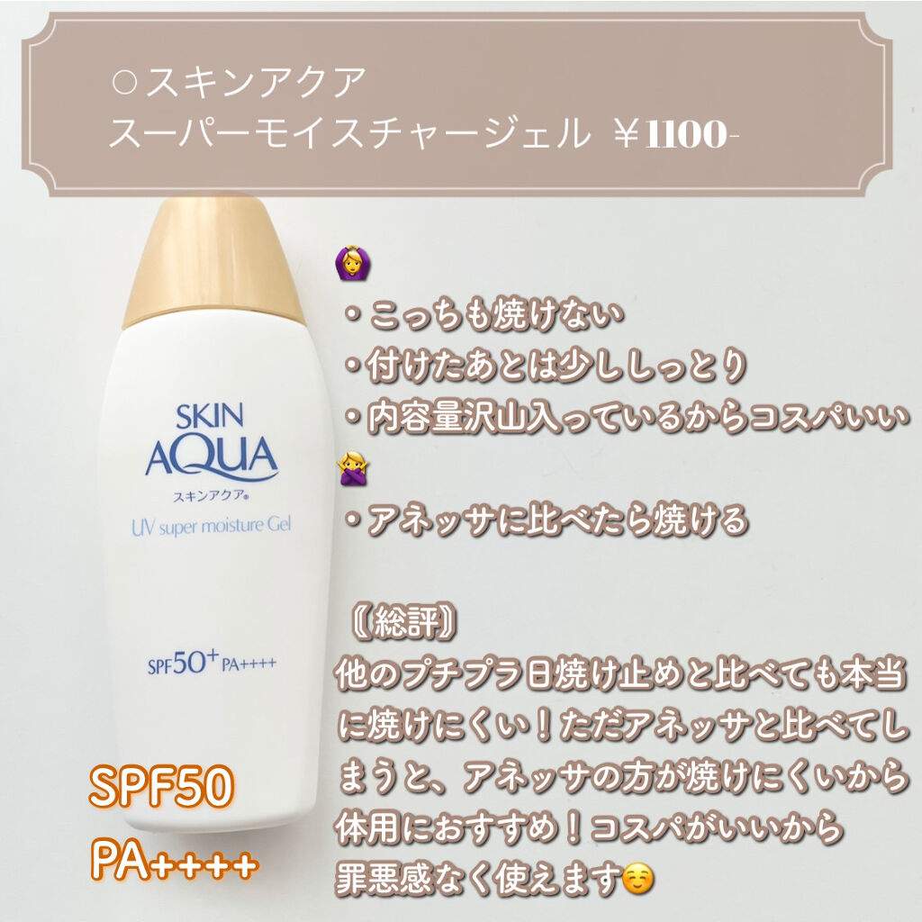 春の日差し☀️、実はもう夏並みに強いって知ってましたか?紫外線ダメージを防ぐために、今からしっかりUVケアを始めましょう!そこで、オススメの日焼け止めを3つご紹介します!🌟スキンアクアスーパーモイスチャージェルポイント・レビュー:お手頃価格な...