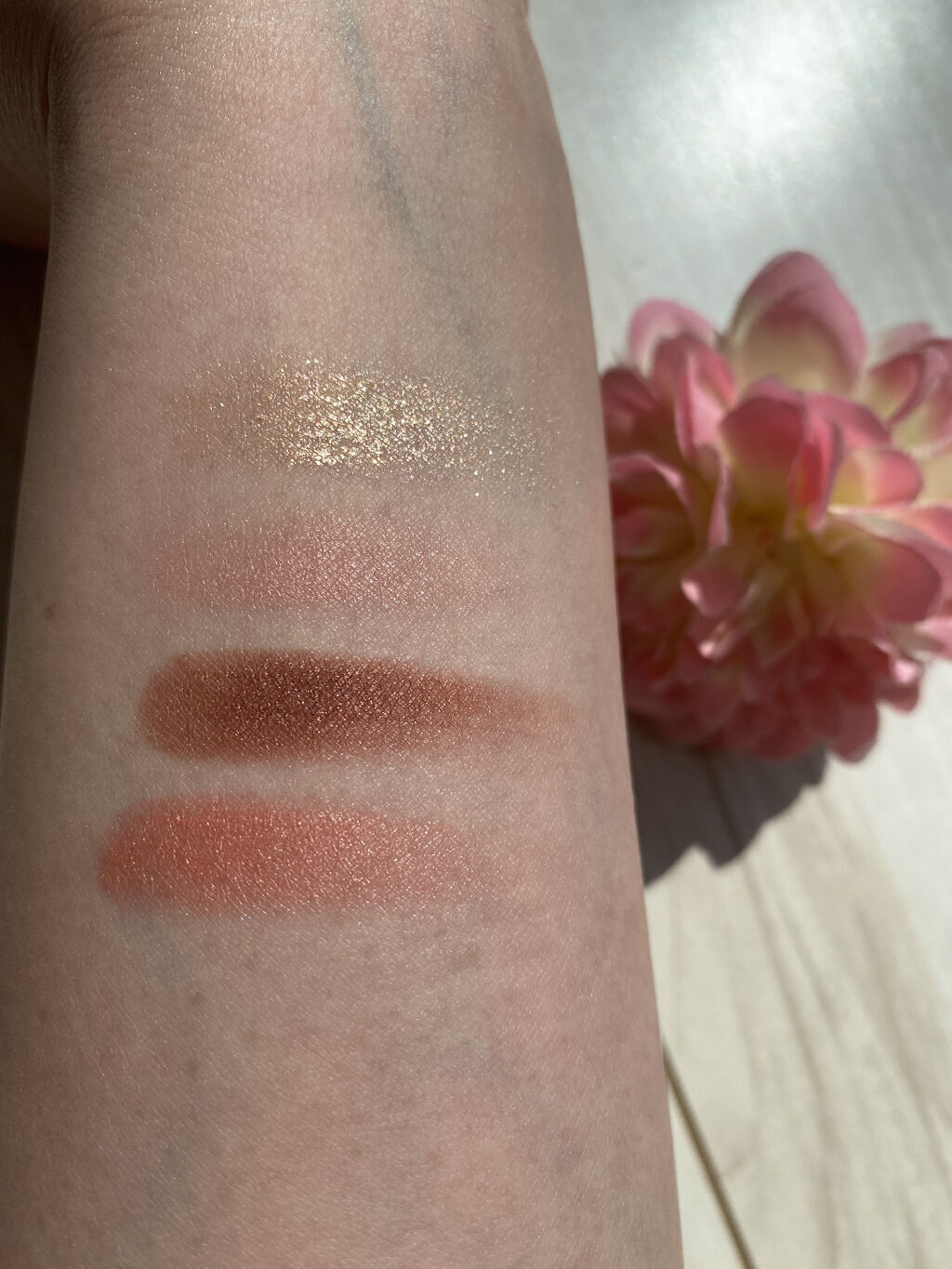 陽雫はもうキランキラン✨✨で可愛すぎました❤️ 多色ラメって美しすぎるよね° ✧ (*´ `*) ✧ ° スウォッチは3度塗りぐらいしてるので、薄づきも重ね塗りも楽しめる感じ💡 シルバーラメが目立つので華やかな印象です💕 銀朱に似てるかな?って思ってたけど、銀朱はピンクラメでブロンズっぽい光り方をするので全然別物でした。