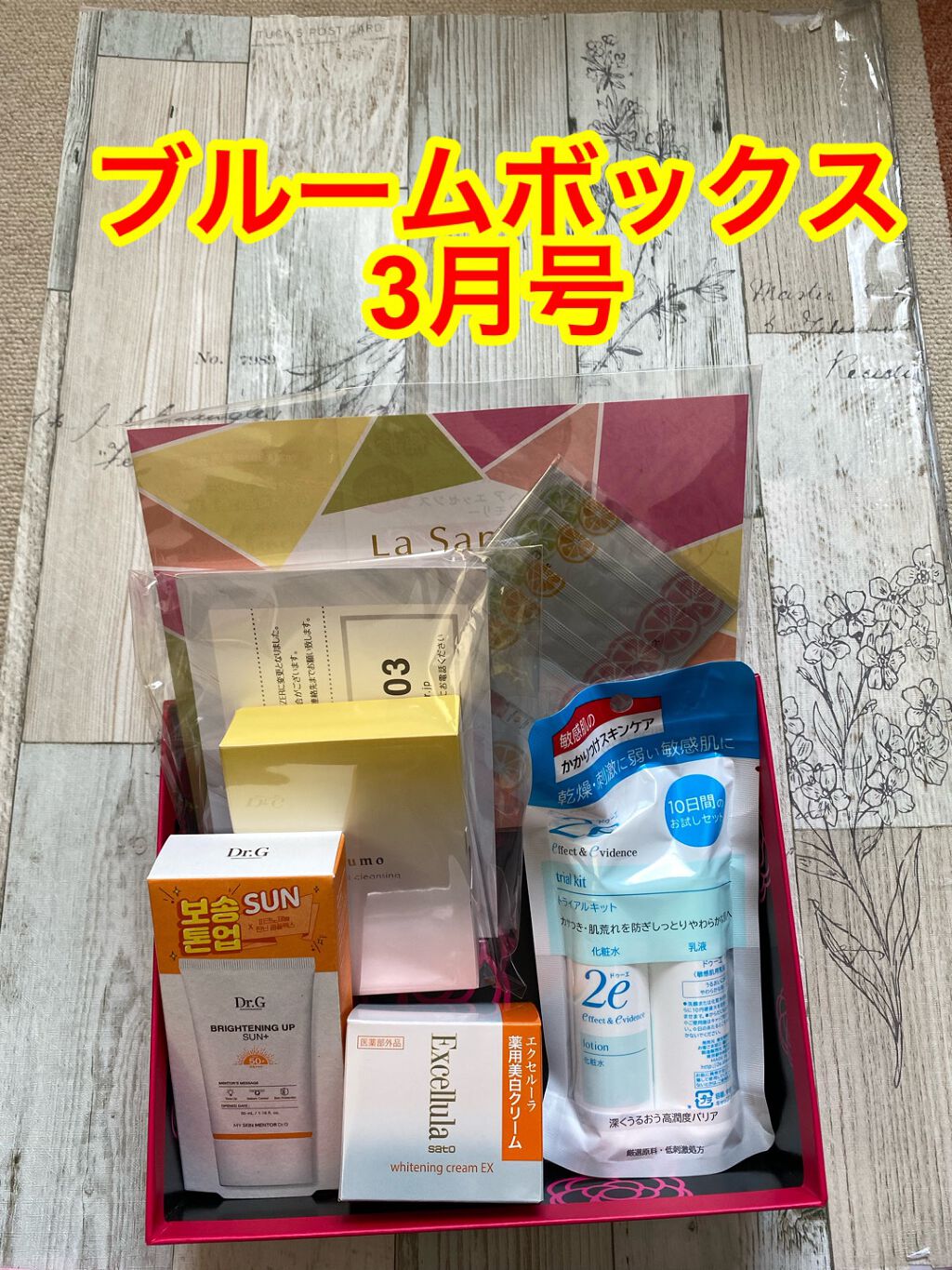 待望の復活初回です✨待ってました〜〜!! てっきり、再開後一番最初なので、以前の時のようにモリモリでくるのかな?と思ったのですが、段ボールが意外にも小さめでびっくり👀📦 bidolの現品2つに、ルミアグラスのアイライナーも現品。 どちらも持っていないカラーなので、よかったです。 食品枠もまたあると嬉しいな〜✨ 次回にも期待したいです😌✨