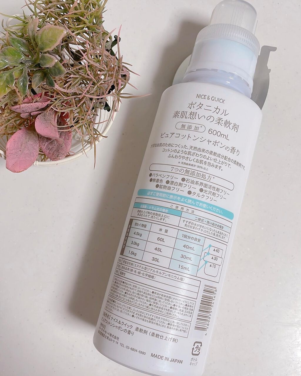 商品詳細情報NICE & QUICK ボタニカル素肌想いの柔軟剤 ピュアコットン シャボンの香り