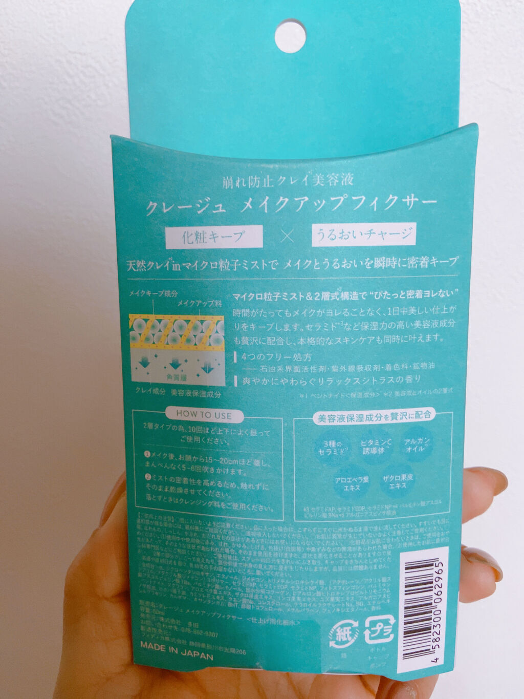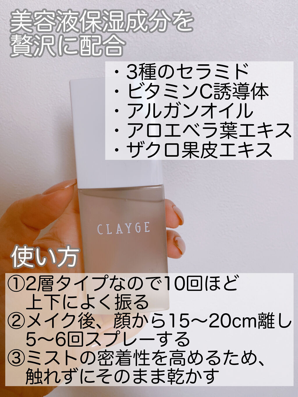 - 微細なマイクロ粒子ミストでメイクキープ&うるおいチャージを瞬時に同時に叶える、化粧崩れ防止クレイ美容液。 天然クレイ成分を配合することでメイクキープ成分が肌面にぴたっと密着、メイクをしっかり固定しながら動きに合わせて伸縮するため擦れやヨレに強く長時間美しい仕上がりをキープ。汗・皮脂プルーフ成分も配合でメイクのテカリやにじみも防ぎ、マスク着用による崩れも防止してメイクがマスクに付きにくくします。 またオイルin2層式構造で、3種のセラミドやビタミンC誘導体をはじめとする美容液レベルの贅沢なスキンケア成分が肌に潤い補給。同時にアルガンオイルなど天然由来オイルで表層を包み込んで、乾燥を防ぎサラッと仕上げます。メイクの仕上げとして顔全体にスプレーすると、ストレスを感じないほどきめ細かなミストで肌あたりが柔らかく顔全体にふわっと均一拡散し、しっかりと保湿しながらメイクをフィックス。軽やかな付け心地で、朝のメイク直後だけでなく日中のスキンケアなど、使い方が広がります。 4つのフリー処方(石油系界面活性剤、紫外線吸収剤、鉱物油、着色料)。爽やかにやわらぐリラックスシトラスの香りでリフレッシュ効果も。