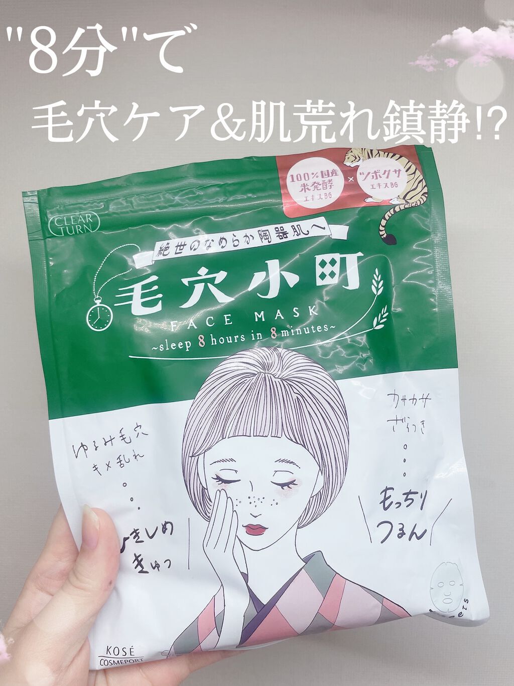 - 毛穴・肌あれが同時にケアできる、毛穴小町マスク! ①毛穴目立ち&肌あれをダブルでケア!なめらか陶器肌へ 水分・油分をバランスよく配合したみずみずしい美容液で、乾燥や皮脂による毛穴目立ちやあれ肌もケアします。キメのととのった、つるんとなめらかな陶器肌に導きます。 角質柔軟成分※3配合。肌をやわらげます。 100%国産米発酵エキス・米ぬかエキス・BG(保湿)をはじめとする発酵ライスモイスチャーCPX配合。ふっくらと保湿します。 ツボクサエキス・ドクダミエキス・BG(保湿)配合。ツボクサエキスは今話題のCICA成分です。肌をひきしめととのえます。 ※3 角質柔軟成分はリンゴ酸 ②角質ケアできる凸凹高密着シート コットン生まれでやわらかな肌触りの国産シートを採用。シートマスクの表面には凸凹のエンボス加工を施しているため、密着性が高く、はがしたマスクでやさしく顔をふきとることで角質ケアもできます。 ③心地よい眠りにみちびくようなリラックスフローラルの香り(天然香料配合) ④やさしい使い心地 弱酸性・無着色・無鉱物油・パラベンフリー・紫外線吸収剤フリー・シリコーンフリーのやさしい使い心地です。