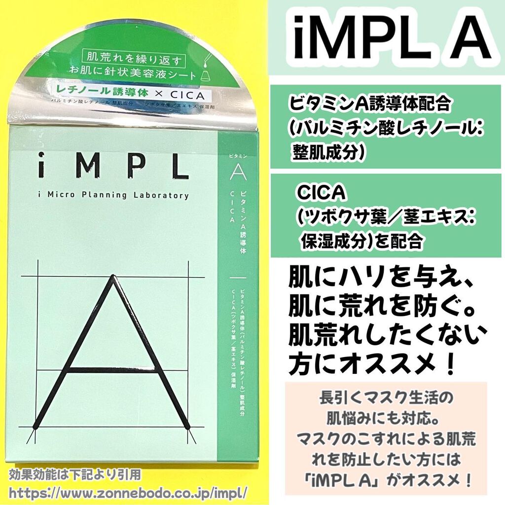 - (iMPL A) ヒアルロン酸Na、グリセリン、水、パルミチン酸レチノール、ツボクサ葉/茎エキス、BG、ジラウロイルグルタミン酸リシンNa (iMPL B) ヒアルロン酸Na、グリセリン、水、ナイアシンアミド、アーチチョーク葉エキス、BG (iMPL C) ヒアルロン酸Na、グリセリン、水、3-O-エチルアスコルビン酸、リン酸アスコルビルMg、ジラウロイルグルタミン酸リシンNa