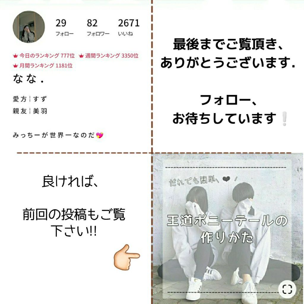 王道ポニーテールは、 ”顎と、耳の延長線上”で 髪の毛を結ぶと 綺麗なポニーテールに仕上がる❕ ヘアワックスを馴染ませることで、 まとまりやすくなり、アホ毛などが 気になりにくくなるので◎ まずは、耳から上の部分の髪だけを取って 髪を結ぶ位置を決めます. 顎と耳の延長線上で結ぶととてもいい 仕上がりになります💎💎 今度は、上の部分の髪に、 耳から下の部分の髪の毛を取り、 上の髪と合流させます. ⚠位置が崩れないように! すごく単純ですが、髪の毛が ゆるくならないようにしっかりと固定させて ゴムで結びます. 2つのゴムを使うと固定しやすくなる! 最後に、ケープ(固めるもの)やピンで おくれ毛を無くしたり、髪の毛が まとまりやすくなるように仕上げをします. 少し大きめのピンも◎◎◎