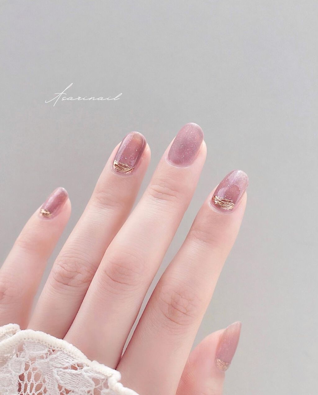 まさに銀河みたいなキラキラカラーがたくさんです!🪐 シルバーホロにパープル系ラメがチラチラしていて、色んなカラーと合わせやすそう🥰 中指は新色のミルクホワイトで周りをぼかしたよ🥛もや〜っと柔らかくなって可愛い♡ 親指はラメ2色で塗りかけして星座っぽく三角形をのせました☺️💫