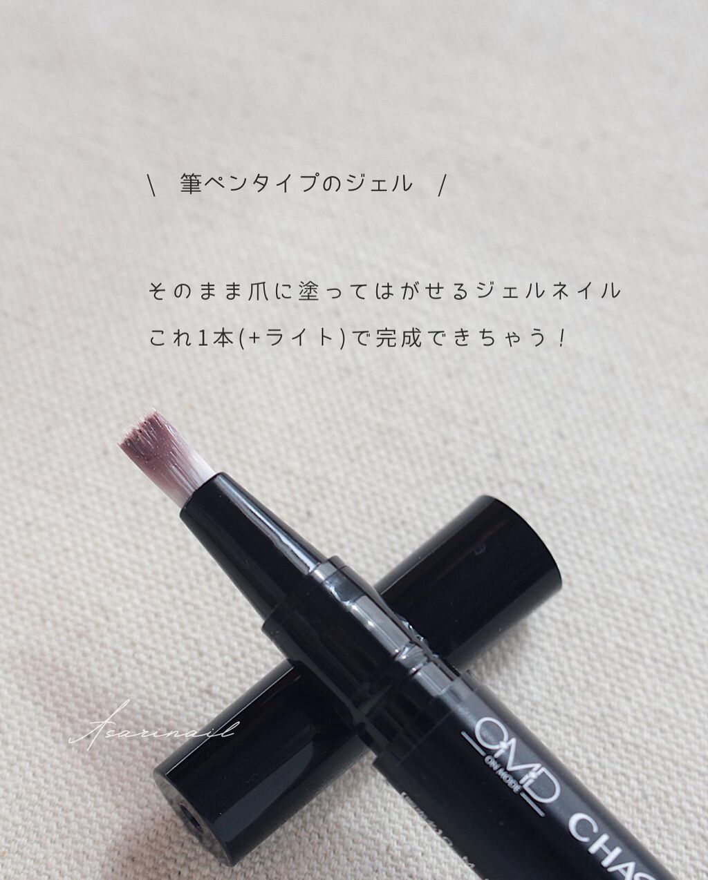 - 「ベース」「カラー」「トップ」の3つの役割を1本で果たす、便利なオールインワンジェル。ペンのような感覚で持つことができ自爪も塗りやすく、収納もコンパクト。リムーバー無しで剥がしてオフできるからその日だけネイルにもぴったりです。さらに特有の嫌なニオイがほとんどなく、パラベンやタルクなども処方されていません。誰でもネイルを楽しめます。