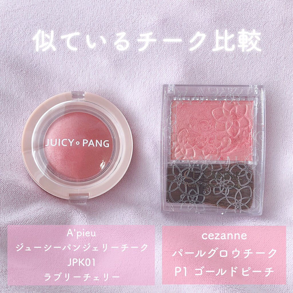 A’pieuアピュージューシーパンジェリーチークCR01RD01ヘビロテしてる個人的マストアイテム!ふんわり感もしっとり感も、じゅわっと感も作れちゃう☺️質感としては、パウダーファンデよりもリキッドorクッションファンデと合わせる方が良いので...