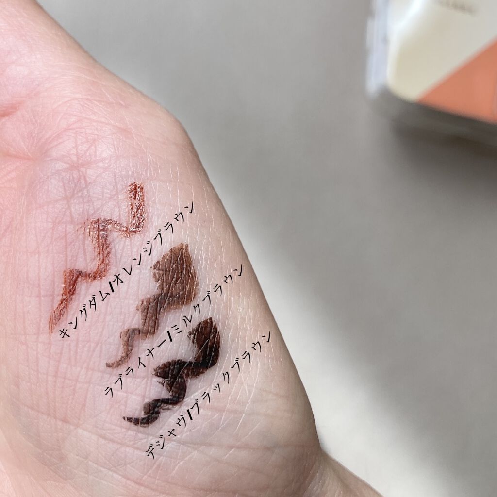 - ◆ディープブラック 水、アクリレーツコポリマーアンモニウム、BG、アセチルテトラペプチド-3、アカツメクサ花エキス、ヒアルロン酸Na、加水分解シルク、パンテノール、ローヤルゼリーエキス、オタネニンジン根エキス、ゴボウ根エキス、セラミドNP、加水分解コラーゲン、マコンブエキス、AMP、ポリグリセリル-3ジシロキサンジメチコン、水添パーム油脂肪酸グリセリズ、パルミチン酸スクロース、デキストラン、トリオレイン酸ソルビタン、ベヘネス-30、シメチコン、メチルパラベン、パルミチン酸ソルビタン、ラウリン酸ソルビタン、エチルパラベン、トコフェロール、プロピルパラベン、ベントナイト、クエン酸、フェノキシエタノール、カーボンブラック ◆ディープブラウン 水、アクリレーツコポリマーアンモニウム、BG、アセチルテトラペプチド-3、アカツメクサ花エキス、ヒアルロン酸Na、加水分解シルク、パンテノール、ローヤルゼリーエキス、オタネニンジン根エキス、ゴボウ根エキス、セラミドNP、加水分解コラーゲン、マコンブエキス、AMP、ポリグリセリル-3ジシロキサンジメチコン、水添パーム油脂肪酸グリセリズ、パルミチン酸スクロース、デキストラン、トリオレイン酸ソルビタン、ベヘネス-30、シメチコン、メチルパラベン、パルミチン酸ソルビタン、ラウリン酸ソルビタン、エチルパラベン、トコフェロール、プロピルパラベン、ベントナイト、クエン酸、フェノキシエタノール、赤226、黄205、カーボンブラック ◆ディープブラウン 水、アクリレーツコポリマーアンモニウム、BG、アセチルテトラペプチド-3、アカツメクサ花エキス、ヒアルロン酸Na、加水分解シルク、パンテノール、ローヤルゼリーエキス、オタネニンジン根エキス、ゴボウ根エキス、セラミドNP、加水分解コラーゲン、マコンブエキス、AMP、ポリグリセリル-3ジシロキサンジメチコン、水添パーム油脂肪酸グリセリズ、パルミチン酸スクロース、デキストラン、トリオレイン酸ソルビタン、ベヘネス-30、シメチコン、メチルパラベン、パルミチン酸ソルビタン、ラウリン酸ソルビタン、エチルパラベン、トコフェロール、プロピルパラベン、ベントナイト、クエン酸、フェノキシエタノール、赤226、黄205、カーボンブラック ◆バーガンディ 水、アクリレーツコポリマーアンモニウム、BG、アセチルテトラペプチド-3、アカツメクサ花エキス、ヒアルロン酸Na、加水分解シルク、パンテノール、ローヤルゼリーエキス、オタネニンジン根エキス、ゴボウ根エキス、セラミドNP、加水分解コラーゲン、マコンブエキス、AMP、ポリグリセリル-3ジシロキサンジメチコン、水添パーム油脂肪酸グリセリズ、パルミチン酸スクロース、デキストラン、トリオレイン酸ソルビタン、ベヘネス-30、シメチコン、メチルパラベン、パルミチン酸ソルビタン、ラウリン酸ソルビタン、エチルパラベン、トコフェロール、プロピルパラベン、ベントナイト、クエン酸、フェノキシエタノール、赤226、カーボンブラック ◆オレンジブラウン 水、アクリレーツコポリマーアンモニウム、BG、アセチルテトラペプチド-3、アカツメクサ花エキス、ヒアルロン酸Na、加水分解シルク、パンテノール、ローヤルゼリーエキス、オタネニンジン根エキス、ゴボウ根エキス、セラミドNP、加水分解コラーゲン、マコンブエキス、AMP、ポリグリセリル-3ジシロキサンジメチコン、水添パーム油脂肪酸グリセリズ、パルミチン酸スクロース、デキストラン、トリオレイン酸ソルビタン、ベヘネス-30、シメチコン、メチルパラベン、パルミチン酸ソルビタ ン、ラウリン酸ソルビタン、エチルパラベン、トコフェロール、プロピルパラベン、ベントナイト、クエン酸、(チタン/酸化チタン)焼結物、フェノキシエタノール、酸化鉄、カーボンブラック ◆モーヴピンク 水、アクリレーツコポリマーアンモニウム、BG、アセチルテトラペプチド-3、アカツメクサ花エキス、ヒアルロン酸Na、加水分解シルク、パンテノール、ローヤルゼリーエキス、オタネニンジン根エキス、ゴボウ根エキス、セラミドNP、加水分解コラーゲン、マコンブエキス、AMP、ポリグリセリル-3ジシロキサンジメチコン、水添パーム油脂肪酸グリセリズ、パルミチン酸スクロース、デキストラン、トリオレイン酸ソルビタン、べヘネス-30、シメチコン、メチルパラベン、パルミチン酸ソルビタン、ラウリン酸ソルビタン、エチルパラベン、トコフェロール、プロピルパラベン、ベントナイト、クエン酸、キサンタンガム、フェノキシエタノール、赤226、コンジョウ