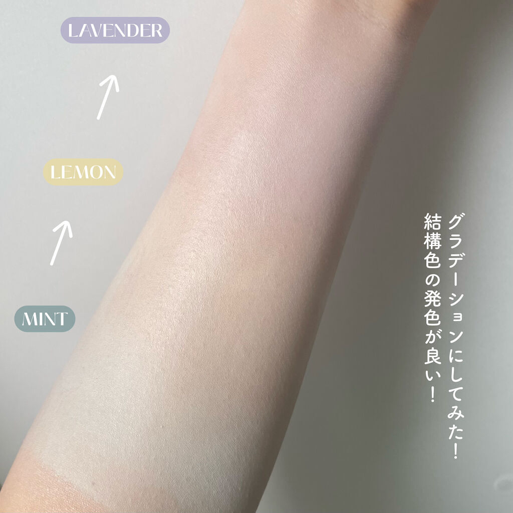 - <ミント> シクロペンタシロキサン、水、グリセリン、酸化チタン、エチルヘキサン酸セチル、BG、ジフェニルシロキシフェニルトリメチコン、メタクリル酸メチルクロスポリマー、メトキシケイヒ酸エチルヘキシル、PEG-10ジメチコン、セスキイソステアリン酸ソルビタン、ジグリセリン、セスキオレイン酸ソルビタン、硫酸Mg、セチルPEG/PPG-10/1ジメチコン、(ベヘン酸/エイコサン二酸)グリセリル、ラウロイルリシン、タルク、ジステアルジモニウムヘクトライト、水酸化Al、アルミナ、ステアリン酸、エチルヘキシルグリセリン、フェノキシエタノール、ジメチコン、炭酸プロピレン、ハイドロゲンジメチコン、ポリクオタニウム-51、ヒアルロン酸Na、酸化スズ、ラベンダー油、ラベンダー花エキス、ヨーロッパキイチゴ果実エキス、ローヤルゼリーエキス、ダイズ種子エキス、(+/-)酸化亜鉛、マイカ、水酸化クロム、グンジョウ、酸化鉄、カルミン、ジミリスチン酸Al <ブルー+(限定)> 水、シクロペンタシロキサン、グリセリン、酸化チタン、酸化亜鉛、BG、エチルヘキサン酸セチル、ジフェニルシロキシフェニルトリメチコン、メタクリル酸メチルクロスポリマー、メトキシケイヒ酸エチルヘキシル、PEG-10ジメチコン、セスキイソステアリン酸ソルビタン、セスキオレイン酸ソルビタン、(ベヘン酸/エイコサン二酸)グリセリル、セチルPEG/PPG-10/1ジメチコン、ラウロイルリシン、硫酸Mg、アルミナ、ジステアルジモニウムヘクトライト、水酸化Al、ジグリセリン、ステアリン酸、エチルヘキシルグリセリン、フェノキシエタノール、ジメチコン、炭酸プロピレン、ハイドロゲンジメチコン、ジミリスチン酸Al、ポリクオタニウム-51、酸化スズ、ヒアルロン酸Na、オトギリソウ花/葉/茎エキス、ダイズ種子エキス、ラベンダー油、ティーツリー葉油、プルーン種子エキス、ローヤルゼリーエキス、ヒメフウロエキス、ラベンダー花エキス、ヨーロッパキイチゴ果実エキス、アーチチョーク葉エキス、グンジョウ、タルク <レモン> シクロペンタシロキサン、水、グリセリン、酸化チタン、エチルヘキサン酸セチル、BG、酸化亜鉛、ジフェニルシロキシフェニルトリメチコン、メタクリル酸メチルクロスポリマー、メトキシケイヒ酸エチルヘキシル、PEG-10ジメチコン、セスキイソステアリン酸ソルビタン、ジグリセリン、セスキオレイン酸ソルビタン、硫酸Mg、セチルPEG/PPG-10/1ジメチコン、(ベヘン酸/エイコサン二酸)グリセリル、ラウロイルリシン、ジステアルジモニウムヘクトライト、水酸化Al、エチルヘキシルグリセリン、アルミナ、合成金雲母、フェノキシエタノール、ステアリン酸、ジメチコン、炭酸プロピレン、ハイドロゲンジメチコン、ポリクオタニウム-51、ヒアルロン酸Na、酸化スズ、ラベンダー油、ラベンダー花エキス、ヨーロッパキイチゴ果実エキス、ローヤルゼリーエキス、ダイズ種子エキス、酸化鉄、ジミリスチン酸Al、タルク、トコフェロール <ラベンダー> シクロペンタシロキサン、水、グリセリン、酸化チタン、エチルヘキサン酸セチル、BG、ジフェニルシロキシフェニルトリメチコン、メタクリル酸メチルクロスポリマー、メトキシケイヒ酸エチルヘキシル、PEG-10ジメチコン、セスキイソステアリン酸ソルビタン、ジグリセリン、セスキオレイン酸ソルビタン、硫酸Mg、セチルPEG/PPG-10/1ジメチコン、(ベヘン酸/エイコサン二酸)グリセリル、ラウロイルリシン、タルク、ジステアルジモニウムヘクトライト、水酸化Al、アルミナ、ステアリン酸、エチルヘキシルグリセリン、フェノキシエタノール、ジメチコン、炭酸プロピレン、ハイドロゲンジメチコン、ポリクオタニウム-51、ヒアルロン酸Na、酸化スズ、ラベンダー油、ラベンダー花エキス、ヨーロッパキイチゴ果実エキス、ローヤルゼリーエキス、ダイズ種子エキス、(+/-)酸化亜鉛、マイカ、水酸化クロム、グンジョウ、酸化鉄、カルミン、ジミリスチン酸Al <フィルターホワイト> シクロペンタシロキサン、水、酸化チタン、マイカ、グリセリン、メトキシケイヒ酸エチルヘキシル、PEG-10ジメチコン、プロパンジオール、ペンチレングリコール、酸化亜鉛、ジグリセリン、ステアリン酸、水酸化Al、オクチルドデカノール、タルク、トリイソステアリン酸ポリグリセリル-2、トリメチルシロキシケイ酸、パルミチン酸エチルヘキシル、イソステアリン酸、フェノキシエタノール、クエン酸Na、ジステアルジモニウムヘクトライト、ポリグリセリル-3ポリジメチルシロキシエチルジメチコン、ジメチコン、(ジメチコン/ビニルジメチコン)クロスポリマー、トリエトキシシリルエチルポリジメチルシロキシエチルヘキシルジメチコン、グリチルレチン酸ステアリル、トコフェロール、アルミナ、アルガニアスピノサ核油、カニナバラ果実油、マカデミア種子油、BG、ラベンダー油、ヒアルロン酸Na、ローヤルゼリーエキス、ダイズ種子エキス、ラベンダー花エキス、ジパルミチン酸アスコ