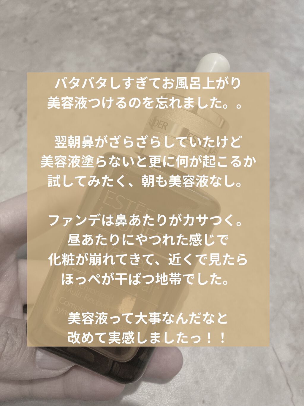 エスティーローダーナイトリペアはとにかく浸透がよく、翌日すぐに良さを実感できます!! 匂いが独特ですが私は大丈夫です。続けることにより肌の改善がみられました。わりと即効性がありました。 コスメデコルテリポソームは香りがよく、お風呂上がりすぐにぬりすごくすーっと浸透していくのがわかりました ただ、保湿力はいまいちでした。夏場に使いたいです!!! ランコムジェニフィックはこちらも翌日すぐ良さがわかりました。ただ香りがきつめの香水みたいで匂いに敏感な私にはきつかったです。なので現品は買わないです。。