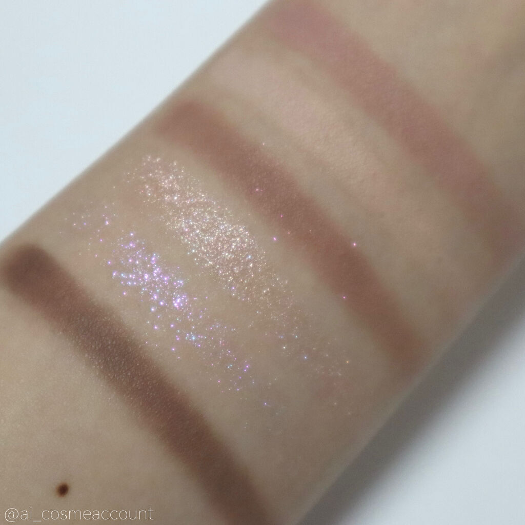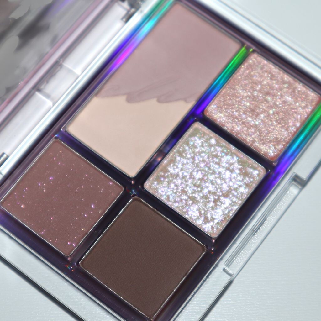 - 同系色陰影カラーと上品でクリアなグリッターの組み合わせの必要なカラーだけ詰め込んだミニアイパレット!