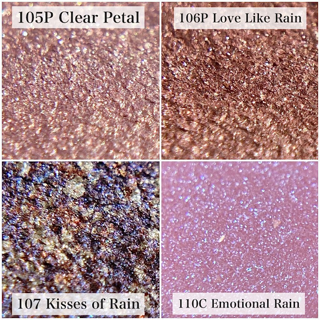 使用感としてはクリーミーなタッチで するする〜っと滑らかにかけます🎶 それなのに少しおくとピタッと密着して 指で擦っただけでは落ちないしよれない😳❗️ R1 KISS FROM A ROSEは ペタルピンクカラー✨ 購入した4色の中で1番可愛らしいカラー💓 シルバーラメがたっぷりで透明感があるなぁという感じ😊 ピンクパールも煌めいて本当に可愛いカラー🥰 R2 WILD ROSEは シャンパンピンクカラー✨ ベージュ寄りのカラーで、ピンク感が少なめなので 肌馴染みが良い🙆♀️ 涙袋にのせても可愛いカラーです💓 使いやすいカラーであまり使う人を選ばないカラーかなと思います❣️ R3 STRIKE A ROSEは テラコッタローズカラー✨ ややオレンジみのあるカラーで カジュアルな感じのメイクにぴったりなカラー😊 チラチラと煌めくラメが可愛いです💕 R4 BED OF ROSESは ローズピンクカラー💓 くすみ感のあるカラーで、ピンクやブルーのパールがたっぷり😍 とってもおしゃれなカラー❣️