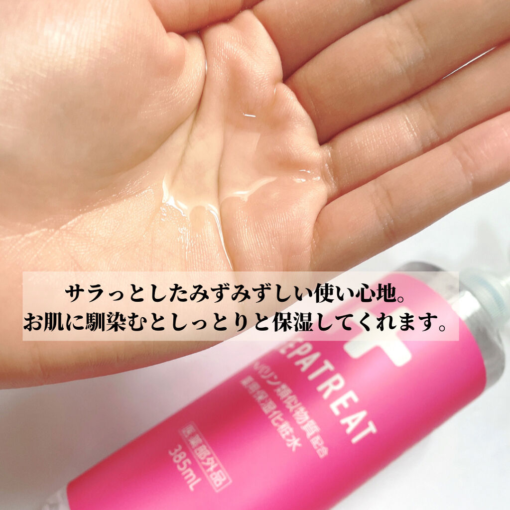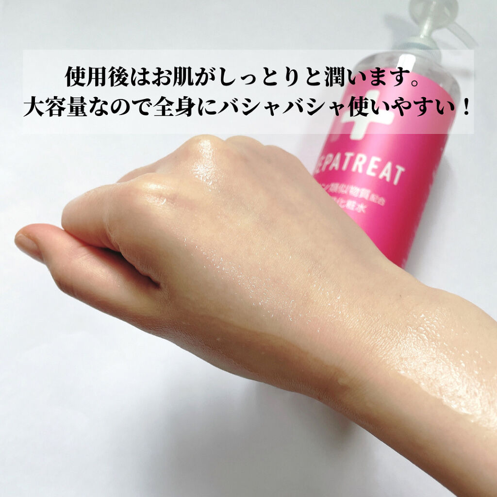 - ヘパトリートは保水有効成分のヘパリン類似物質と肌あれ有効成分のグリチルリチン酸ジカリウムを配合し、8つのフリーを実現。低刺激処方ながら高機能な化粧水です。さらに、薬用化粧水では珍しい大容量ポンプ(385mL)でとても使いやすく、赤ちゃんから大人まで、顔や全身の肌あれ・乾燥に使えます。 ■Wの有効成分 1.ヘパリン類似物質 顔・全身の乾燥を防ぐ 肌の乾燥による肌あれ/あれ性/皮膚を健やかに保つ/肌を整える/あせも/ひび/あかぎれ 2.グリチルリチン酸ジカリウム ニキビを防ぐ/肌をひきしめる/日やけ、雪やけ後のほてりを防ぐ/しもやけ/かみそりまけを防ぐ ■肌にやさしい低刺激処方<8つのフリー> 無香料/無着色/無鉱物油/無動物油/パラベンフリー/アルコールフリー/石油系界面活性剤フリー/シリコンフリー ※パッチテスト済み ※スティンギングテスト済み