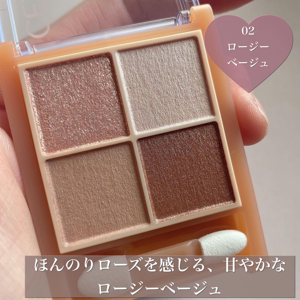 - ラメ・パール・マット3質感の4色アイシャドウ。 肌馴染みの良いベージュを基調としたカラー。ラメ・パール・マットの3質感を重ねて、自然にまぶたを強調し奥行のある大きな目元へ。 しっとり溶け込むような柔らかなパウダーなので、スルスル伸びてまぶたにピタッと密着。保湿成分(スクワラン・ホホバ種子油)配合。