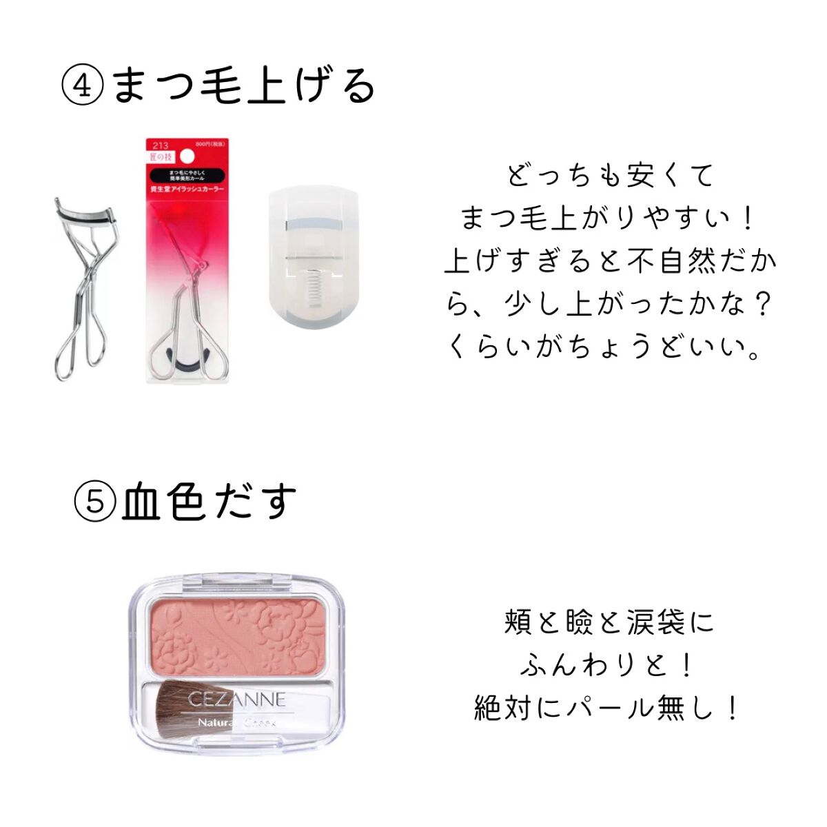全部1,000円以内で買えます! スキンアクアトーンアップUVエッセンス 緑は、私が赤みのある肌だからか、紫よりもトーンアップ効果が高かったです👍 ビオレUV アクアリッチ ライトアップエッセンス 綺麗に肌が白く見えます!毛穴も無くなる! ベビーパウダー アニュームセバムコントロールパウダー ビックリするくらいサラサラになる。 ダイソーUR GRAM まあ粉質はそんな良くないけど、100円なら十分すぎる。 The SAEMコンシーラー01 明るめのコンシーラーならなんでもいい。 SHISEIDOアイラッシュカーラー 割と万人に合うカーブの形やから、迷ったらとりあえず買ってみるのがいいと思う。 無印携帯用アイラッシュカーラー