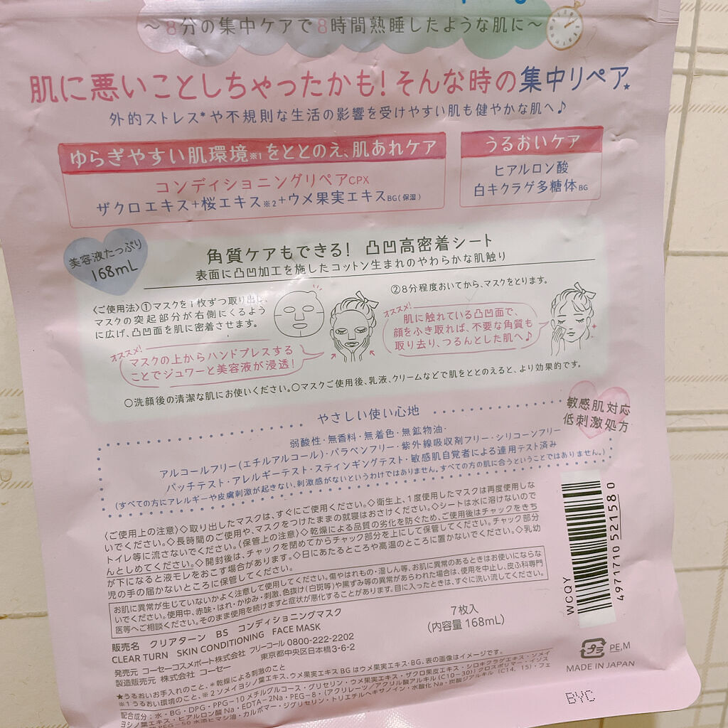 - 【クリアターン ごめんね素肌マスク】 負担をかけて、あれてしまった肌の素肌環境※1をととのえる“速攻集中リペア※2マスク”です。 ① あれがちな肌を素早くコンディションケア! ザクロエキス、桜エキス※3、ウメ果実エキスBG配合し、ゆらぎやすい肌環境をととのえ、肌あれをケアします。また、うるおいケア成分として、ヒアルロン酸、白キクラゲ多糖体BGを配合。外的ストレス※4や不規則な生活の影響を受けやすい肌も健やかでゆらぎにくい肌へみちびきます。 ②敏感肌も使える、弱酸性・低刺激処方 無香料・無着色・無鉱物油・アルコールフリー(エチルアルコール)・パラベンフリー・紫外線吸収剤フリー・シリコーンフリー・パッチテスト済み・アレルギーテスト済み・スティンギングテスト済み・敏感肌自覚者による連用テスト済み(すべての方にアレルギーや皮膚刺激が起きない、刺激感がないというわけではありません。すべての方の肌に合うということではありません。) ③角質ケアもできる!凸凹高密着シート コットン生まれのやわらかな肌触りのベンリーゼを使用。 表面に凸凹のエンボス加工を施しているため、密着性が高く、はがしたマスクでやさしく顔をふきとることで角質ケアもできます。 ※1 うるおい環境のこと ※2 うるおいお手入れのこと ※3 ソメイヨシノ葉エキス、ウメ果実エキスBGはウメ果実エキス・BG(保湿) ※4 乾燥による刺激のこと