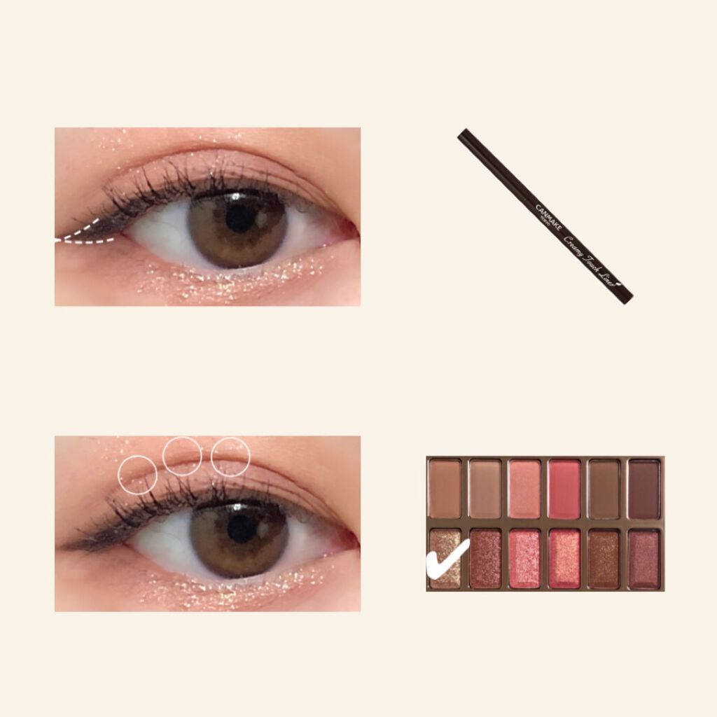 シングルカラーアイシャドウ01パールベージュをアイホール全体に塗ります。 パーフェクトスタイリストアイズNo.18ビタースウィートメモリーの左下のアイシャドウを二重幅に塗ります。 同じくビタースウィートメモリーの右上のアイシャドウを下瞼1/3に塗ります。 同じくビタースウィートメモリーの真ん中のアイシャドウを下瞼2/3に塗ります。 クリーミータッチライナーNo.03ダークブラウンで目尻にアイラインを引きます。 ビューラーでまつげをカールさせてからカールキープマジックを塗ります。
