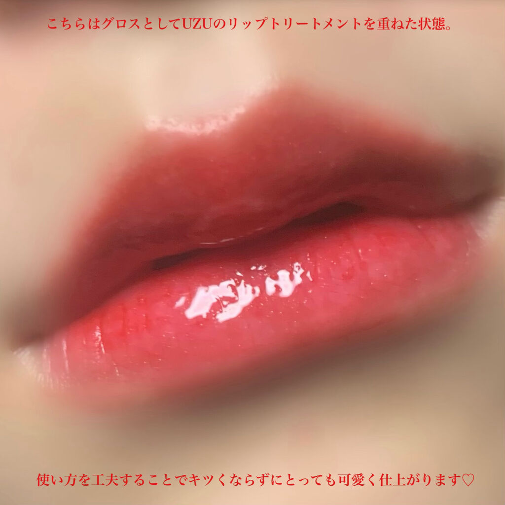 鮮やかな真紅がパッと目を引きます。 しっかり塗りでも似合う方いると思いますが、 日常使いならぽんぽん塗りがおすすめ。 万能リップ美容液…!これは以前から愛用しています。 夜にトリートメントとして塗っても良いし、 このようにグロスとして使っても可愛い。ちらちら細かいラメが入っています。