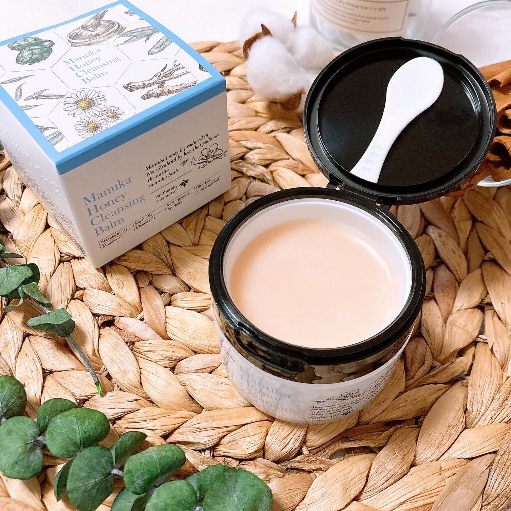 マヌカハニークレンジングバーム🍯.付属のスパチュラでバームを肌にのせて、肌温にとろりととろけるバームは、メイクの上でくるくるするとスルスルメイクと馴染む❤︎.マヌカハニーのおかげか、私は洗い上がりのしっとり感が感じられて満足🫶.抗菌成分を含む...